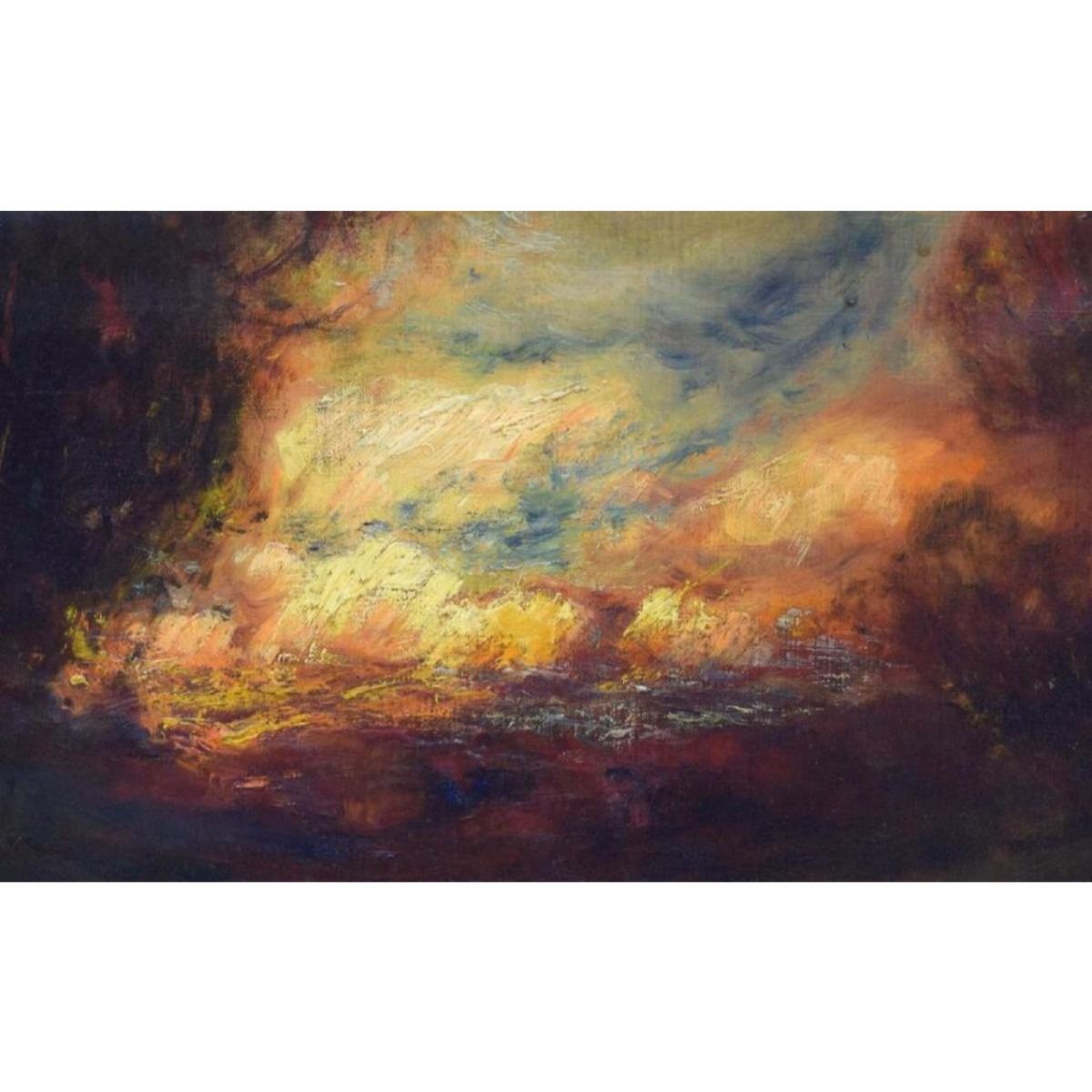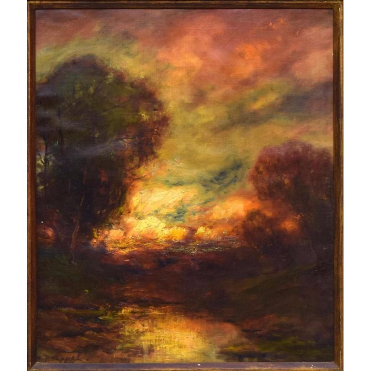 Framed oil painting on canvas, Glorious Sunrise, signed lower left C.P. Appel (Charles P. Appel, New York, 1857-1928), relined, substantial molding loss at frame, loss, sight: 23.5"h, 19,25"w, overall: 32.25"h, 28.5"w, 13lbs