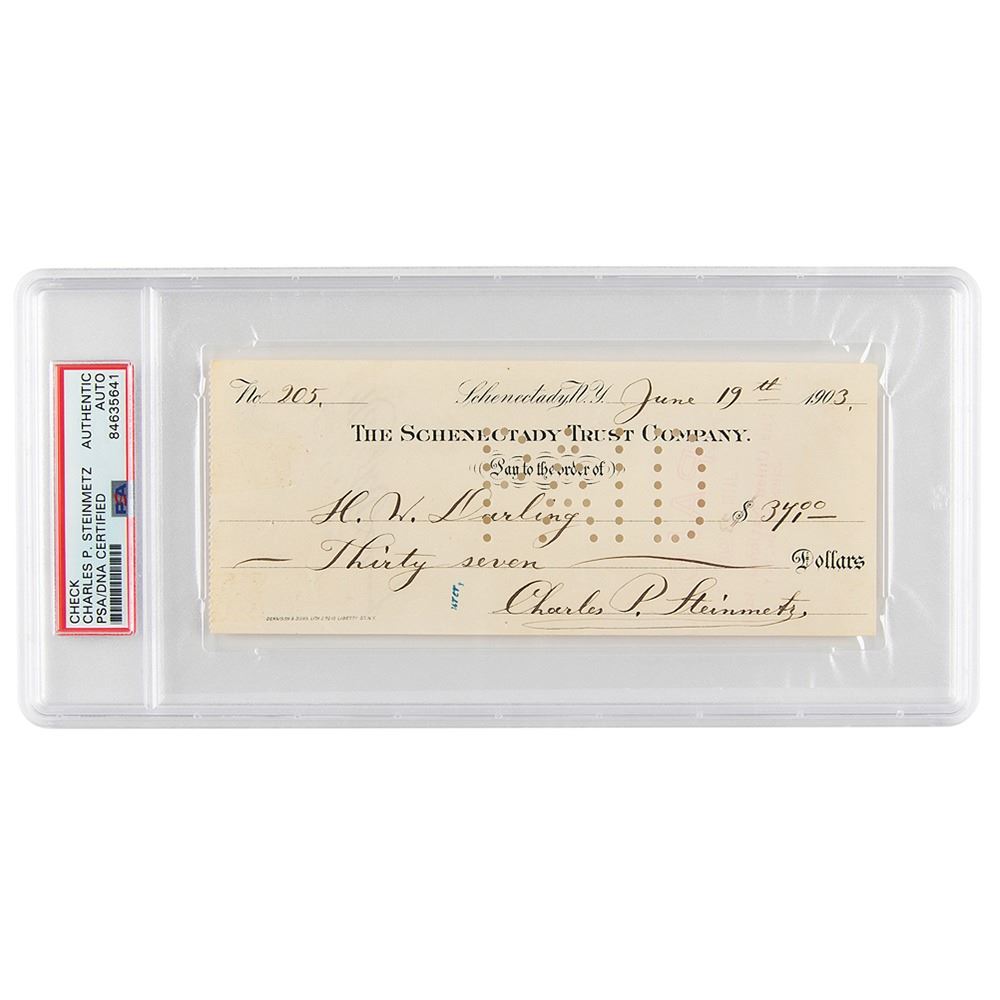 Mathematician and electrical engineer (1865-1923) who made major advances in the development of alternating current. The Schenectady Trust Company check, 6.5 x 2.75, filled out and signed by Charles P. Steinmetz, payable to Henry W. Darling for $37, June 19, 1903. Endorsed on the reverse by Darling. In fine condition. Encapsulated in a PSA/DNA authentication holder. Henry William Darling served as the treasurer of General Electric from 1894 until his retirement in 1924.