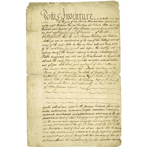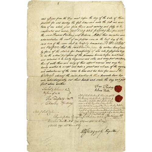<B>Charles Pinckney, (1757 - 1824), Signer of the Constitution, and Governor of South Carolina, Manuscript Document Signed</B></I> "<I>Charles Pinckney</B></I>" as Governor and witness, two pages, 12" x 18.25", Charleston, South Carolina, June 2, 1788, a deed for 100 acres of land in Christ Church Parish, Georgia "<I>...Between Frances Pinckney and Rebecca Mott residuary Devisees and Leagatees of Miles Brewton esquire deceased... and William Clay Snipes of Charleston...</B></I>" Light dampstain, partial fold separation, else very good condition. From the Henry E. Luhrs Collection. <BR><BR><B>Important notice: