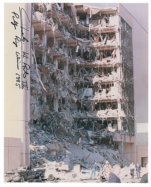 Dramatic color satin-finish 10 x 8 photo of the Alfred P. Murrah Federal Building in downtown Oklahoma City following the 1995 bombing, signed in black felt tip “Charles H. Porter IV, Pulitzer Prize Winner 1995.” In fine condition.