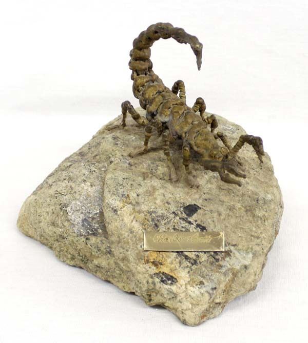 Cheyenne Arapaho Charles Pratt Scorpion on Rock Sculpture, measures 6'' x 7'', FYI: ''Charlie Pratt (b. 1937) is a self-taught artist and has dedicated himself to sculpting with intensity and innovation. When Charlie was in high school and saw some bronze statues, it was then that he knew working in bronze was what he wanted to do with his life. Charlie's work can be found in collections all over the world. He has won over 350 awards from shows across the country and lives in New Mexico.''