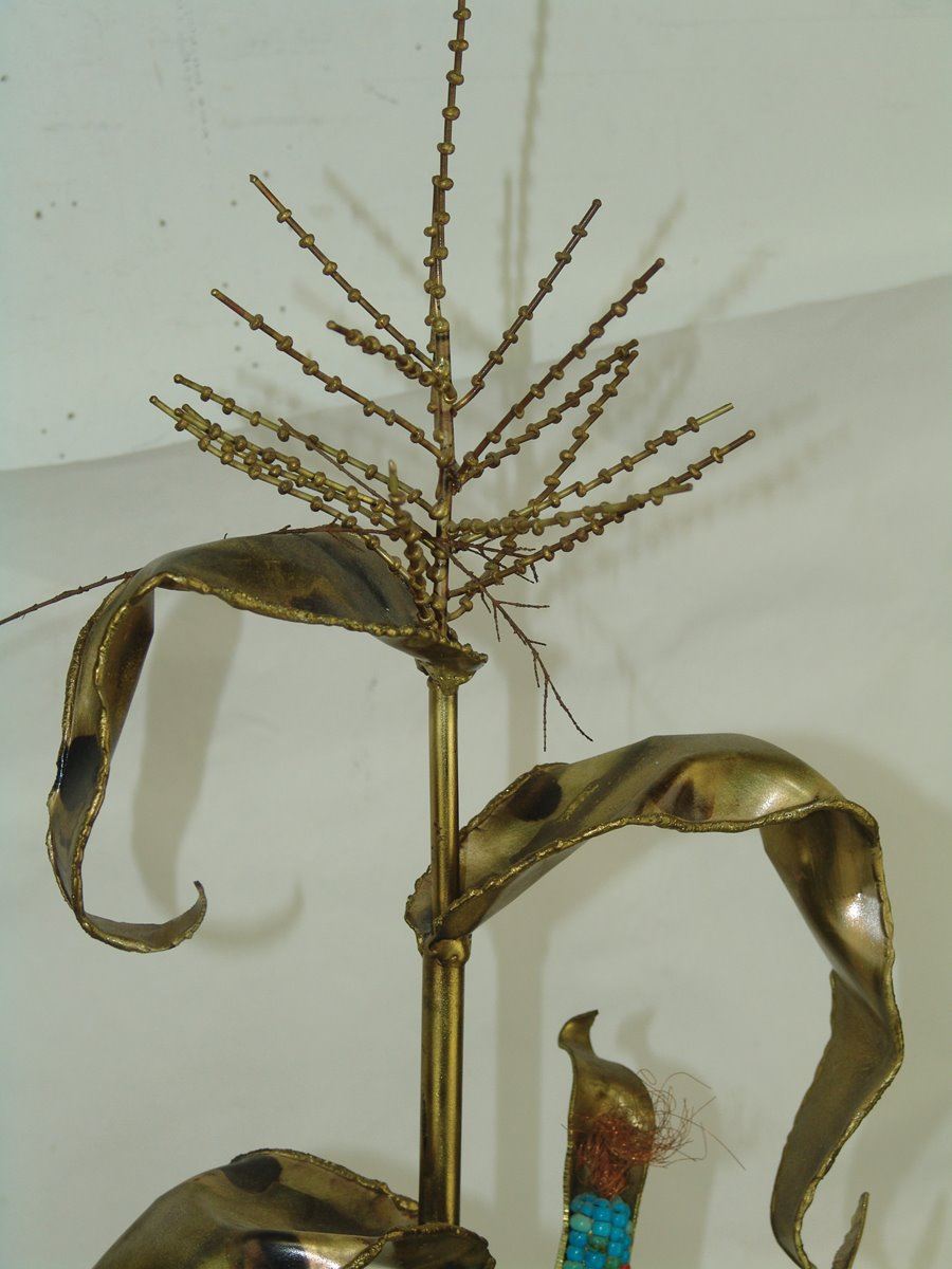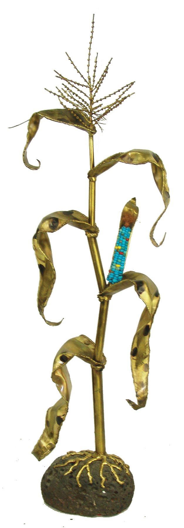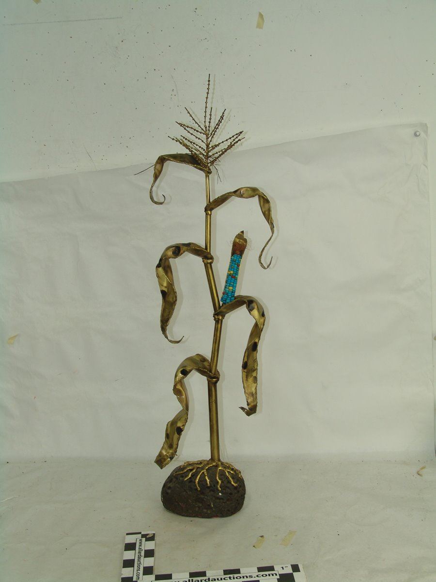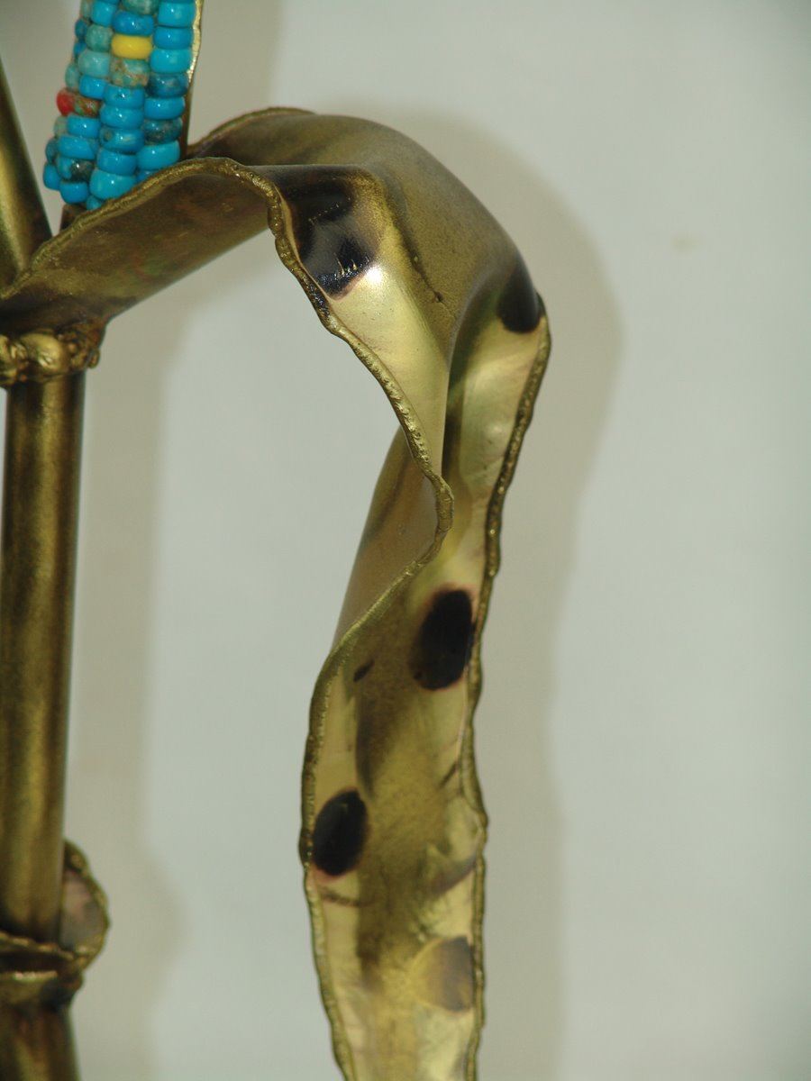 Beautiful, signed original brass sculpture a cornstalk with a single exposed ear of corn made with inlaid turquoise and other stones. Very good condition.,,29"