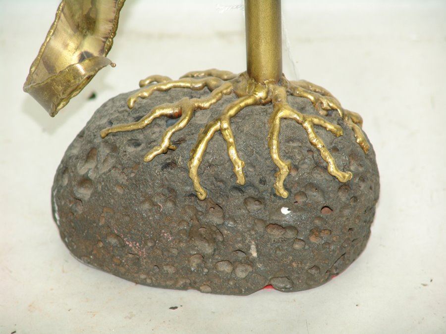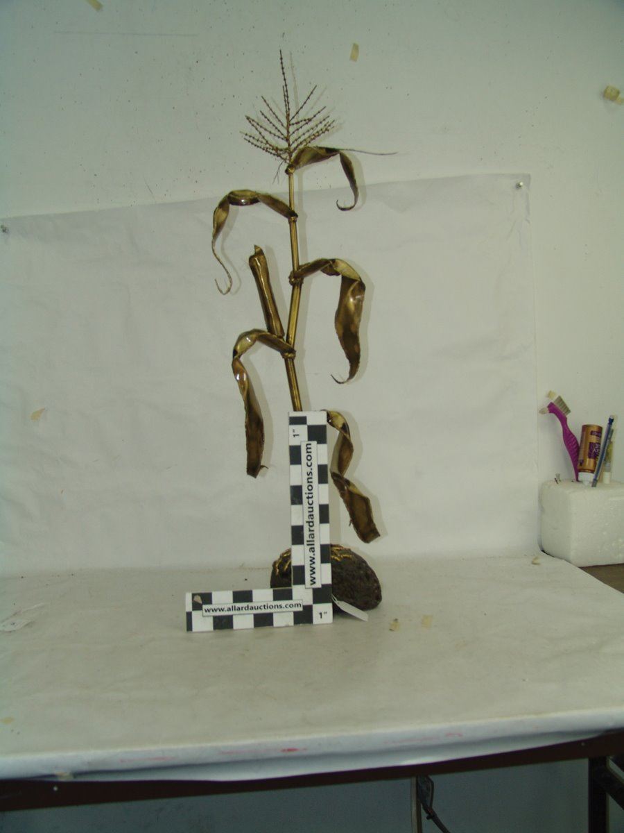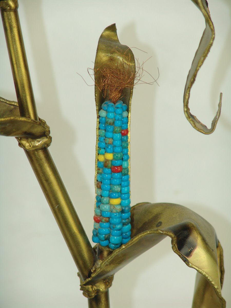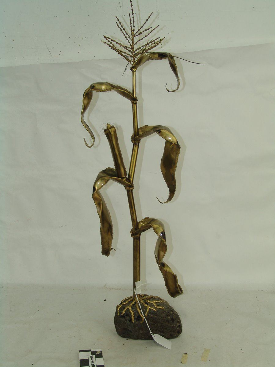 Beautiful, signed original brass sculpture a cornstalk with a single exposed ear of corn made with inlaid turquoise and other stones. Very good condition.,,29"