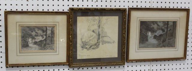 Original ink and wash, approx. 6" H x 9" W sight, 11 1/2" H x 14 1/2" W framed; engraving of farmhouse, initialed lower right, approx. 5" H x 7" W unframed, 10 1/2" H x 12 1/2" W framed; and pencil drawing of landscape, dated 1854, sold by
