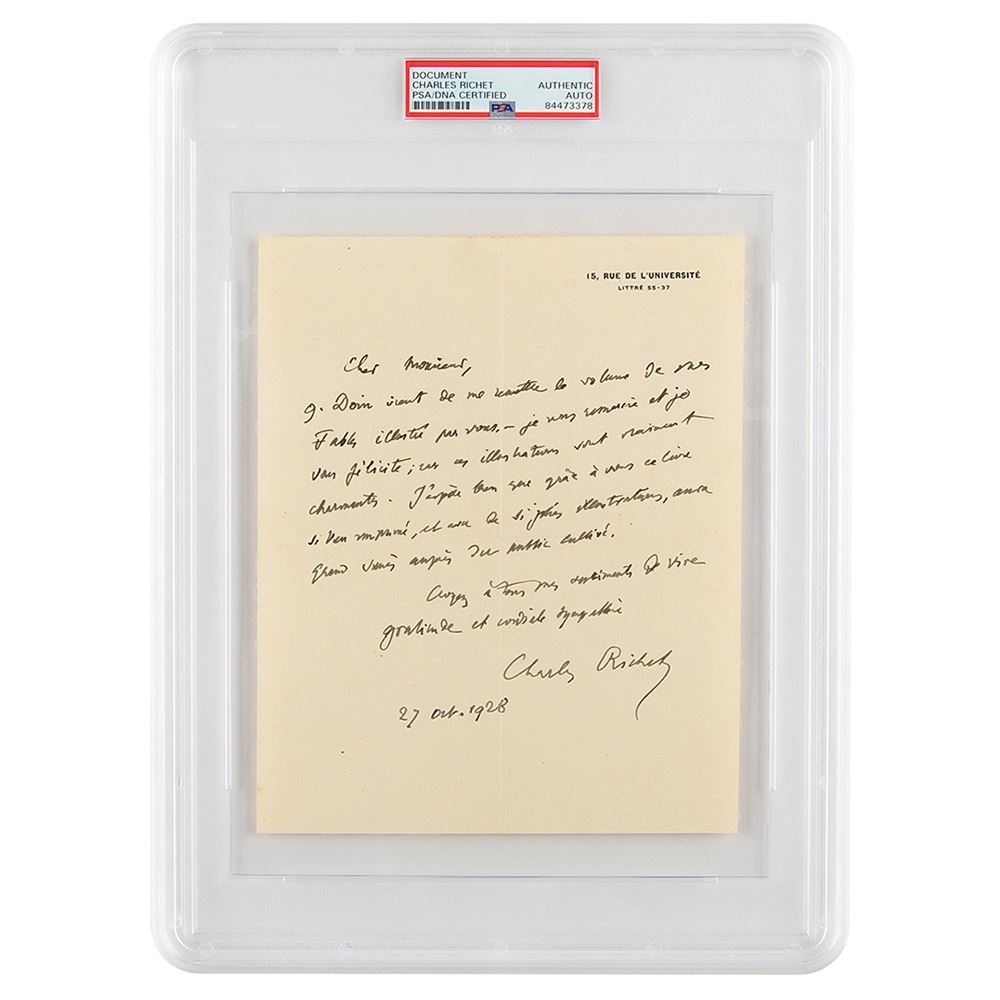 French physiologist (1850-1935) who won the 1913 Nobel Prize in Medicine for his work in anaphylaxis, which led to advances in the treatment of allergies. ALS in French, one page, 6.75 x 8.25, 15 rue de l& #39;Universite letterhead, October 27, 1928. Untranslated handwritten letter by the noted scientist. In fine condition. Encapsulated in a PSA/DNA authentication holder.