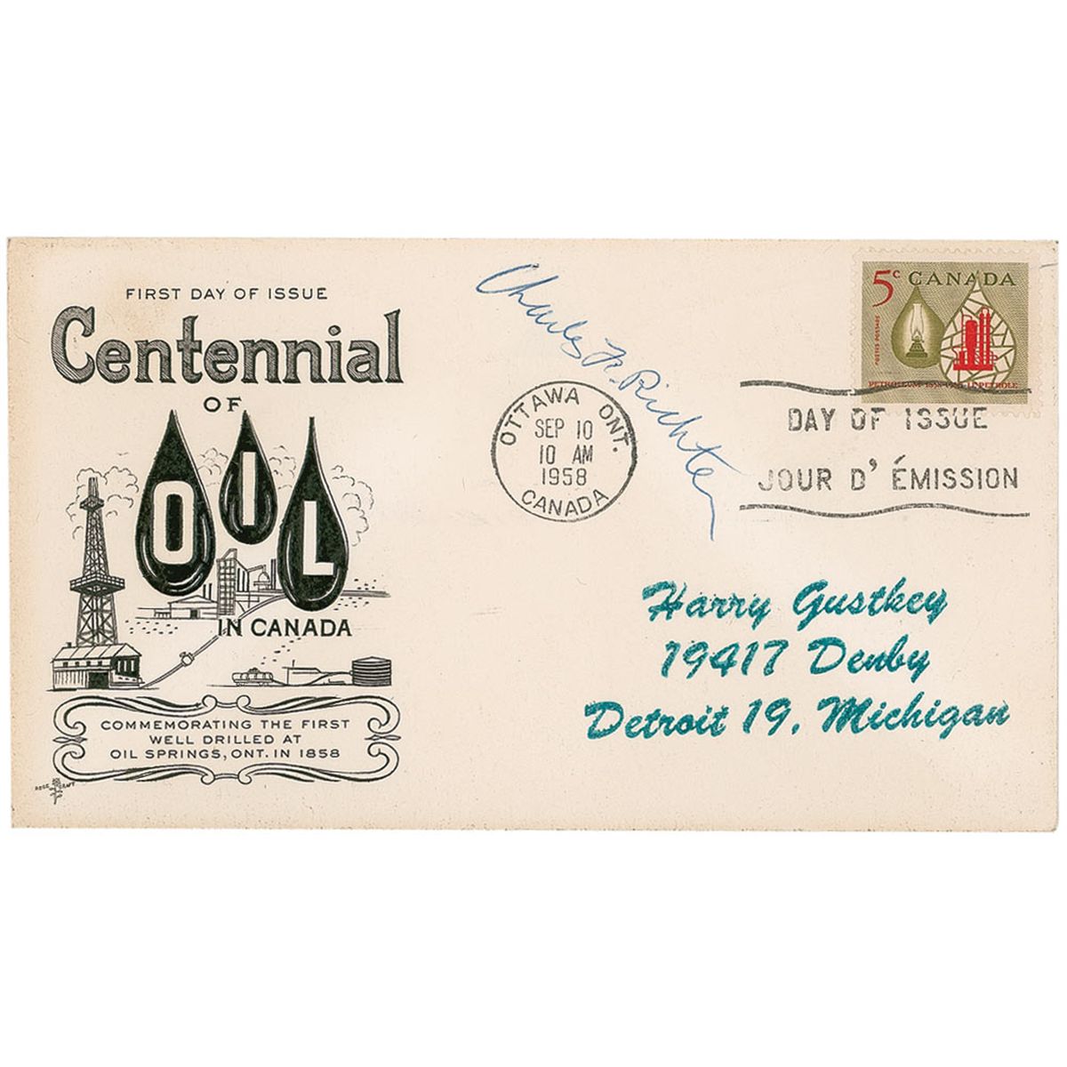 Seismologist, most famous as the creator of the Richter Magnitude Scale which quantifies the size of earthquakes. FDC with a cachet honoring the Centennial of Oil in Canada, signed in blue ballpoint, “Charles F. Richter.” In fine condition, with uniform toning, a bit heavier around the edges, and an address stamp to the body.