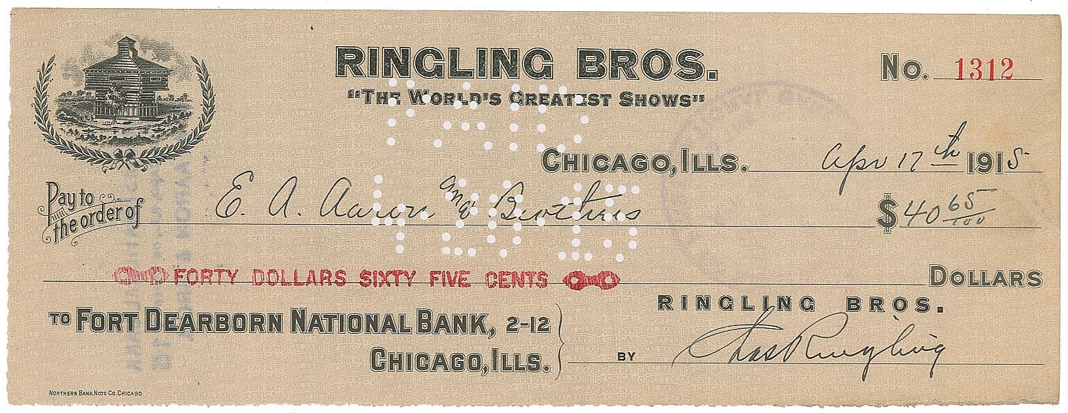 Ringling Bros. business check, 8.5 x 3.25, filled out and signed by Ringling, "Chas. Ringling," payable to E. A. Aaron and Brothers for $40.65, April 17, 1915. In fine condition.