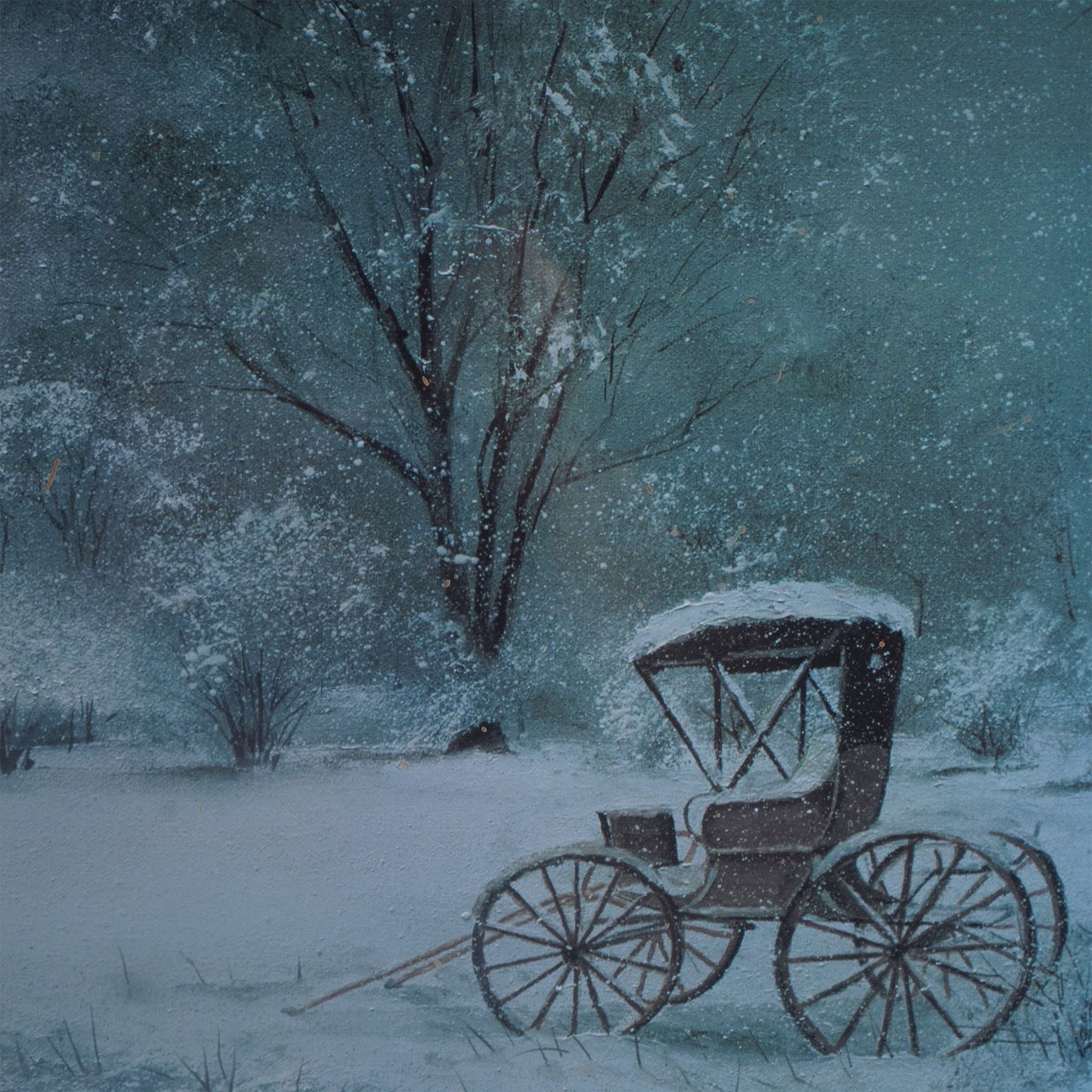 A serene winter landscape print by Charles Roy Smith, titled Home At Last. This evocative artwork captures a snow covered countryside scene featuring a rustic stone house, a horse drawn carriage, and a lone figure walking through the snow. The muted tones and delicate details create a somber and peaceful atmosphere. A wonderful addition for collectors of American landscape art or winter themed decor. Frame measures: 28.25"L x 1"W x 22"H. Sight measures: 19.5"L x 12.5"H.