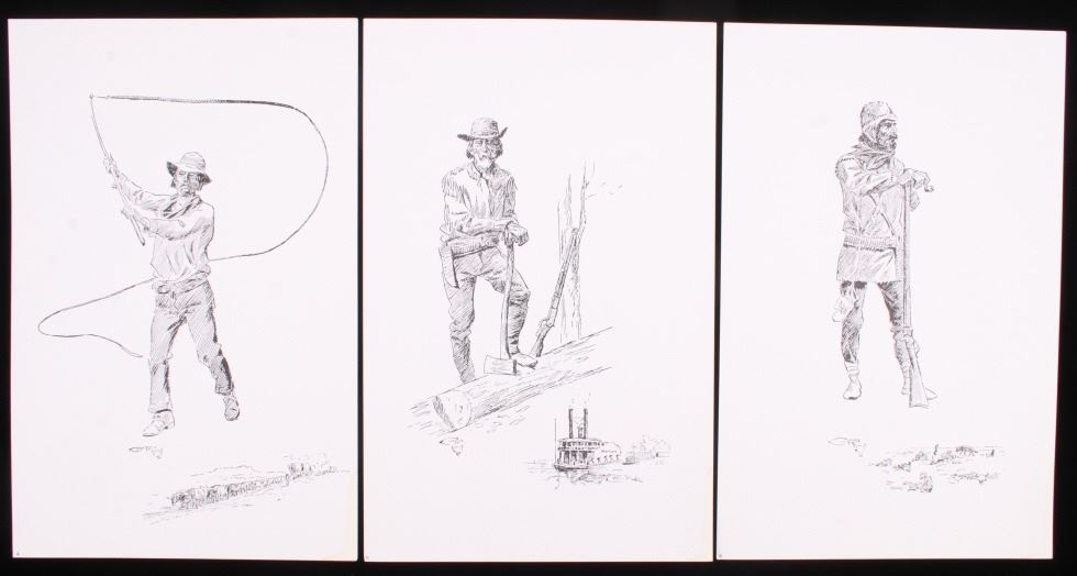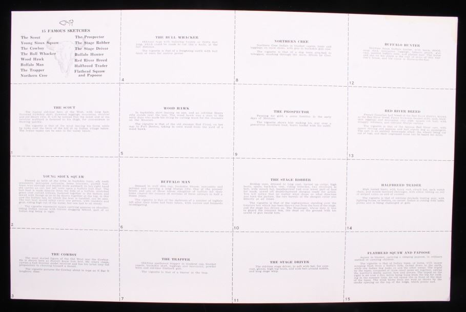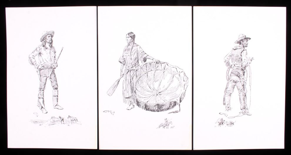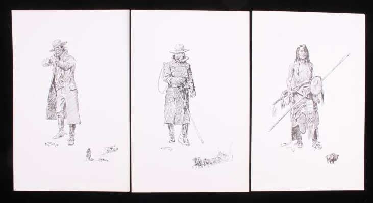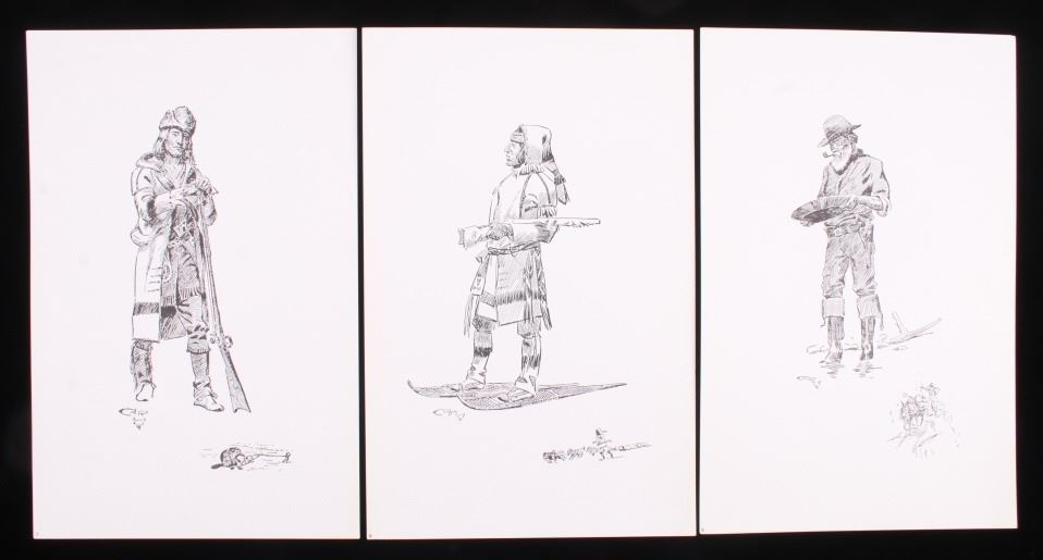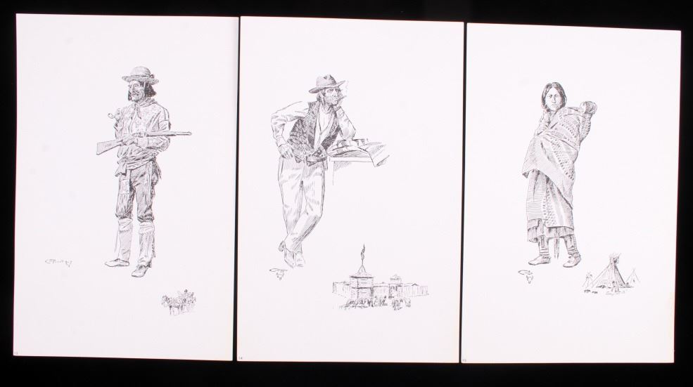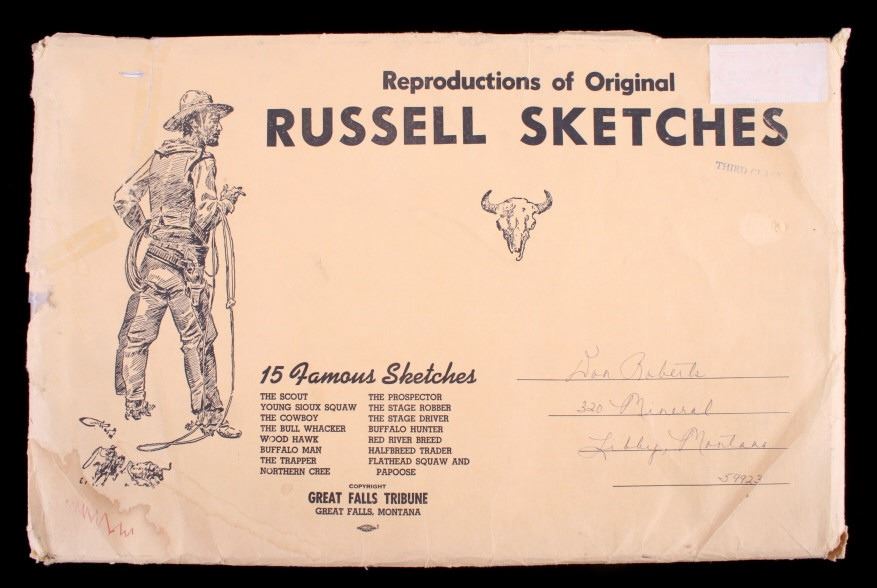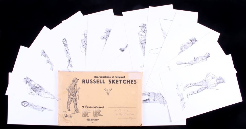 Offered for auction in this lot is a collection of 15 famous sketches by Charles M. Russell. The set is complete, and comes in the original envelope which reads "Reproduction of Original - Russell Sketches - 15 Famous Sketches - Copyright - Great Falls Tribune - G Funk, Montana". The set includes the following; The Scout, The Prospector, Young Sioux Squaw, The Stage Robber, The Cowboy, The Stage Driver, The Bull Whacker, Buffalo Hunter, Wood Hawk, Red River Breed, Buffalo Man, Halfbreed Trader, The Trapper, Flathead Squaw and Papoose, and Northern Cree. Overall, the prints show good condition, with very subtle edge wear to the corners. The envelope measures 17" x 11".