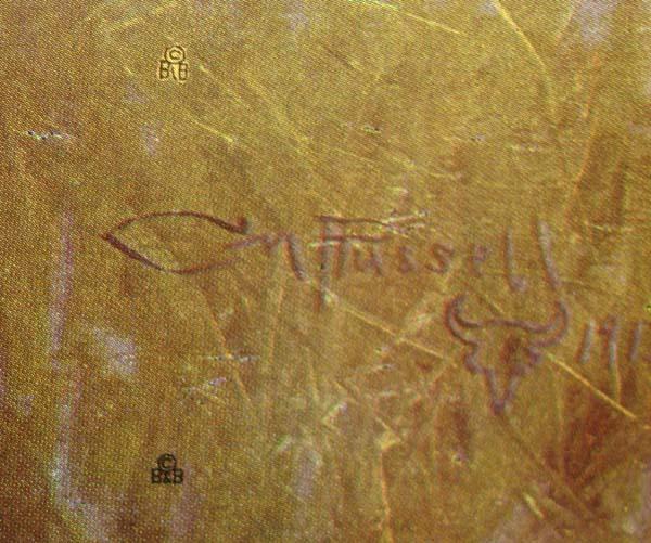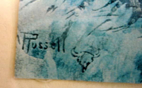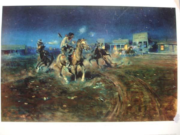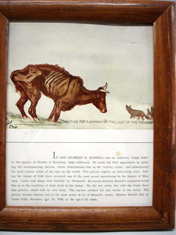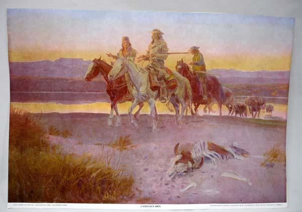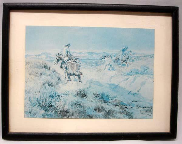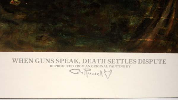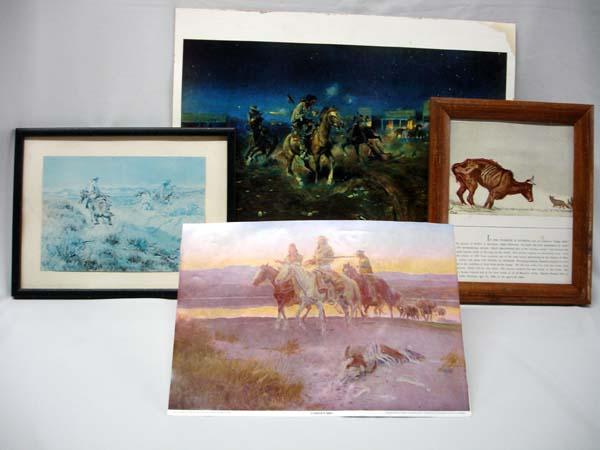 Four Charles Russell Prints. Two framed: ''Waiting for the Chinook,'' with description, 7.5'' x 9.5''. Second is 9.25'' x 6.75'', roping a steer theme. The third unframed reproduction is 14''l x 9.5'' entitled ''Carson's Men.'' 19''x 12'' H ''When Guns Speak, Death Settles Dispute''. Buyers Pay Actual Shipping and Handling Charges(see terms and conditions for more information).