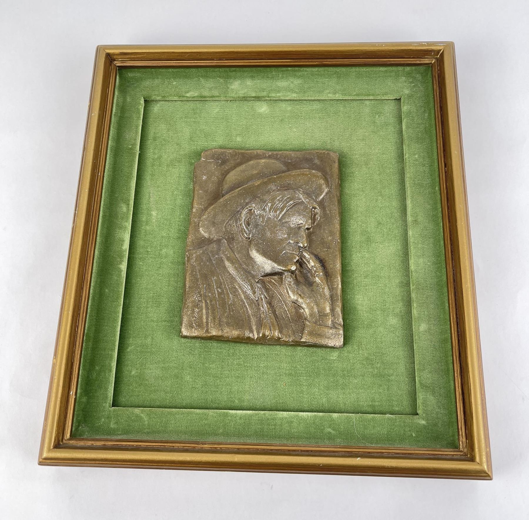Nice bronze. Mounted in a felt shadow box. 11" by 12.5" framed. Born in St. Louis, Charles Russell became a legendary painter and sculptor of frontier activities of the American West. Unlike his well-known counterpart, Frederic Remington, he preferred to paint the Indian and the Cowboys rather than the cavalry men. He was fascinated with western life from an early age when he had heard stories of Indian fighting about his great uncle, Will Bent. Russell's earliest paintings were of war bonneted Indians on horseback. Not interested in school, he left home for Helena, Montana, at the suggestion of his father, who paid his son's way after the youth turned 16. The father thought that rough and tough realities of the West would shake romantic notions of it out of the boy's head. But instead, Russell fell totally in love with the environment. He got a job as a night wrangler, and had the days free for observation and painting. He spent seven years working at cowboy jobs and carried his watercolors in his bedroll and also made clay models of wildlife. He did numerous profiles paintings, and sold his early works among the cowboys for five and ten dollars each. In 1887, he turned down a chance to study in Rome to spend the winter with the Blood Indians in Canada. He became very sensitive to the plight of Indians and respectful of their ways. In 1888, Harper's Weekly published one of his cowboy paintings, and he spent that winter among the Blackfeet Indians of Alberta. He studied their language and ceremonies, and the Chief tried unsuccessfully to get Russell to take an Indian wife. In 1890, a folio of fourteen of his paintings was published, and that same year, he did a mural of ranch life scenes for the iron door of the bank in Lewiston, Montana. But it was not until fall, 1896, that he pursued art as a serious career. That year he married Nancy Cooper, and devoting her life to furthering his career, she persuaded him to set up a studio and do commissions. She became his business manager, and much of his career success is due to her marketing and business skills. In succeeding years, his popularity as an illustrator increased, amazing success considering that he had had only three formal drawing lessons. His paintings of men and wild animals, pitted against tough life in the West, also sold widely to Hollywood celebrities, oil rich collectors, a numerous others who liked reminders of the "wild west." In the early 1900s, Russell and his wife visited Yellowstone National Park, and he later did illustrations reflecting that visit including the book, Fifteen Thousand Miles by Stage by Carrie Strahorn. He regarded the Park as a haven for wild animals, and strongly opposed the idea of anyone killing them for hunting pleasure. Apparently Russell only visited the Park once, in 1902, but in 1915, Nancy Russell came back to the Park by herself and set up an exhibition of her husband's work, which was well received. He traveled frequently throughout the West, and his Arizona painting Navajo Trackers is thought to be his last completed work. He died of heart failure in Great Falls, Montana on October 24, 1926, but during the last seven years of his life, he spent his winters in Pasadena, California.