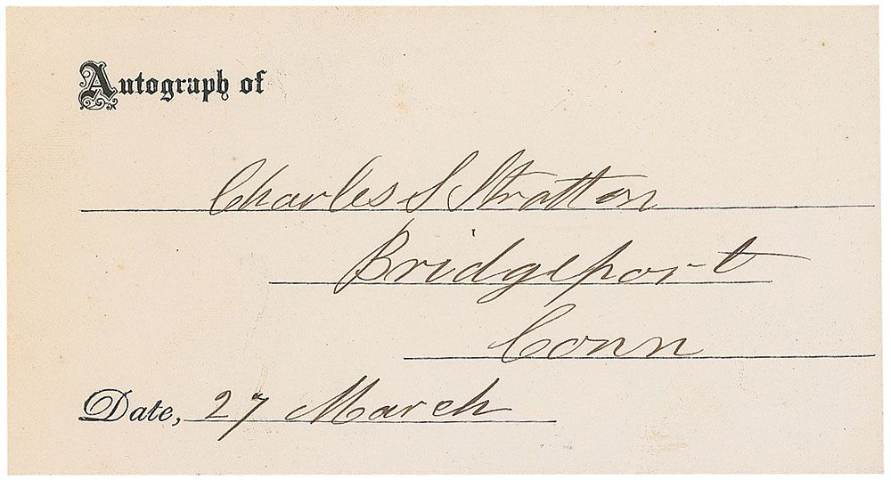 Little person who achieved great fame appearing in P. T. Barnum’s show under the name General Tom Thumb (1838–1883). Ink signature, “Charles S. Stratton, Bridgeport, Conn., 27 March,” on an off-white 5 x 2.75 card. In fine condition.