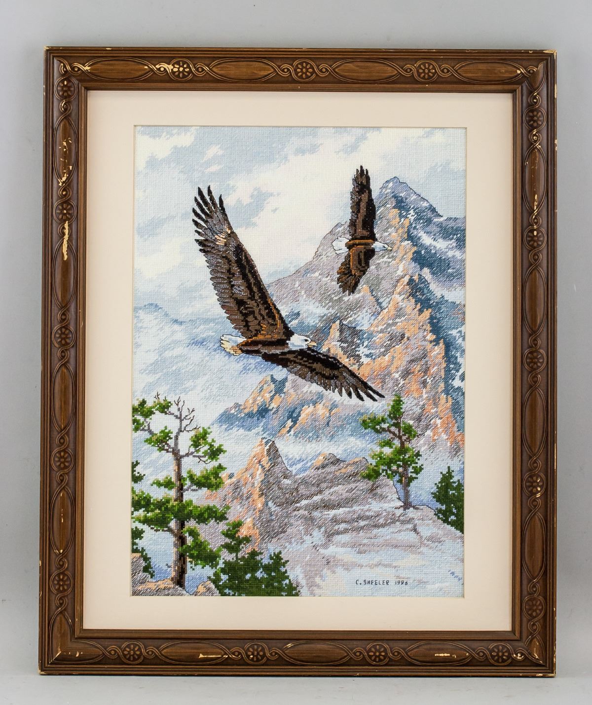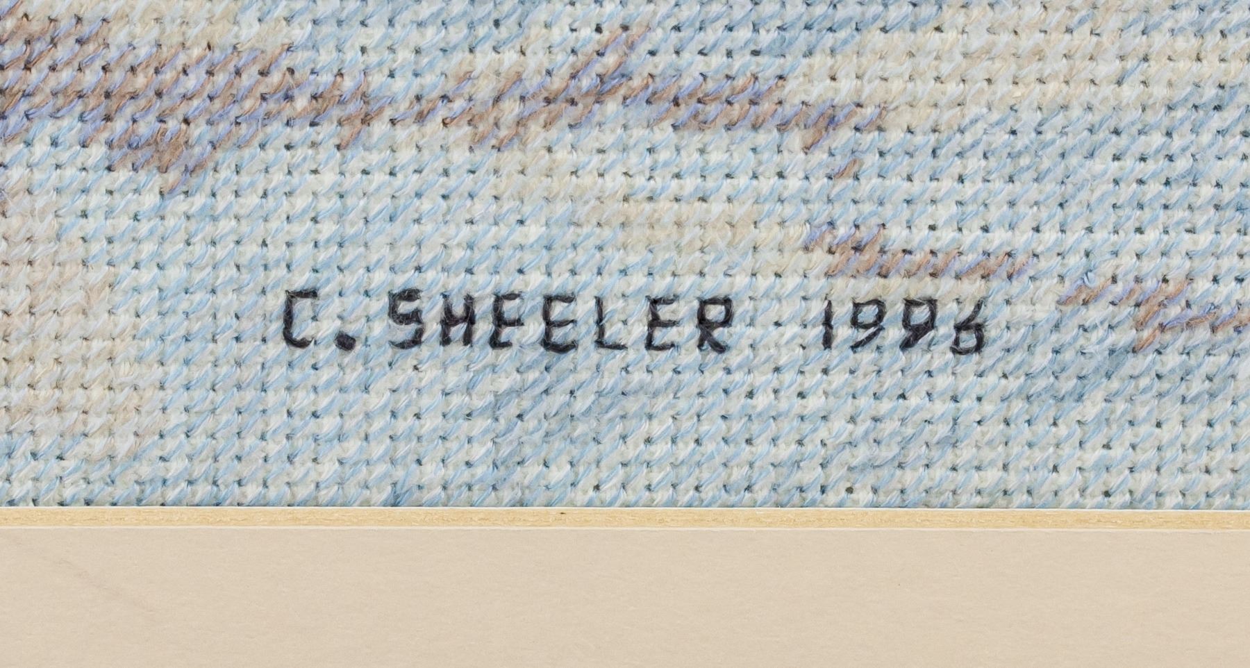 Framed embroidery. Inscribed C. Sheeler 1996 on the lower right corner. 43 x 30 cm (17 x 12 inches). Framed size: 58 x 48 cm (22.75 x 18.75 inches)