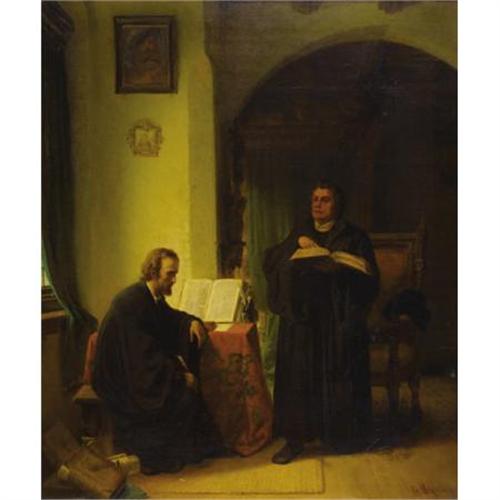 <B>CHARLES (KARL) SCHLESINGER (Swiss, 1825-1893)</B></I><BR><I>Two Men Studying</B></I><BR>Oil on canvas<BR>32 x 26-1/4 inches (81.3 x 66.7 cm)<BR>Signed lower right: <I>Ch. Schlesinger</B></I><BR>