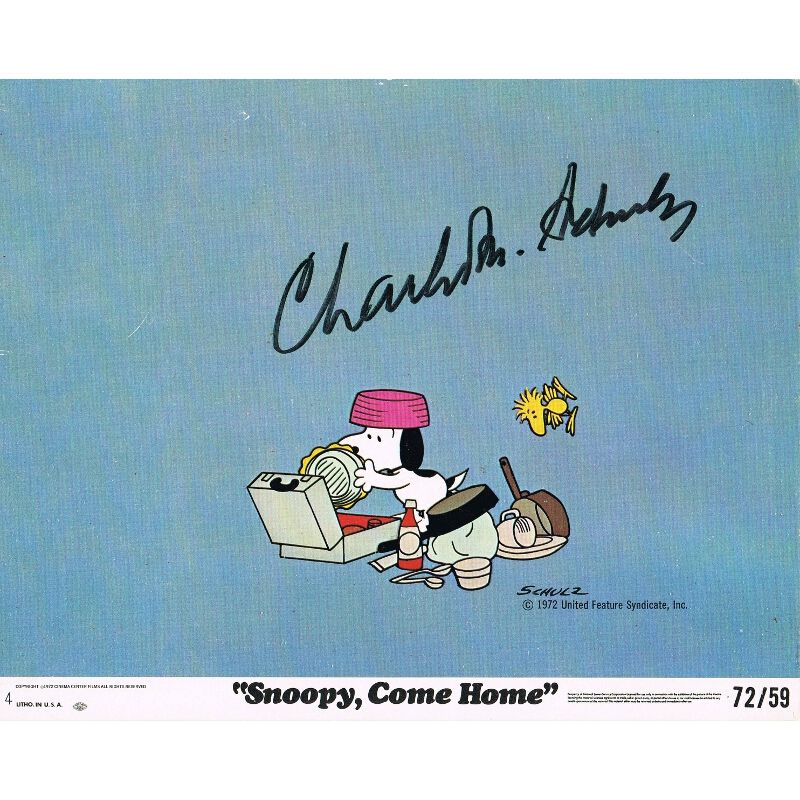 The still features the autograph of Charles Schulz in bold black ink above a drawing of Snoopy packing a suitcase.
