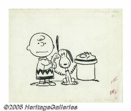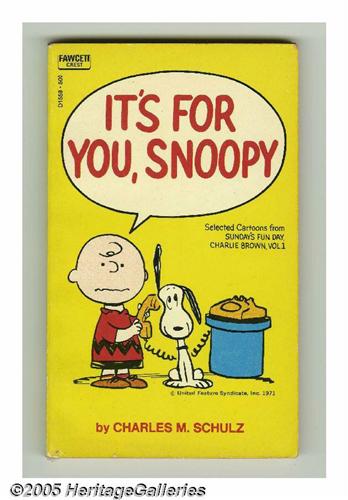 <B>Charles Schulz - Charlie Brown and Snoopy Illustration Original Art (Holt, Rinehart, and Winston, 1965).</B></I> Once again Snoopy proves he is not a typical everyday beagle when the popular pup takes his personal calls on Charlie Brown's house phone! In today's world Snoopy would probably have his own cel phone with text messaging. The drawing was used as a spot illustration on the title page of <B>Sunday's Funday, Charlie Brown</B></I> (Holt Rinehart and Winston, 1965) and it was also used for the cover of Fawcett Crest paperback, <B>It's For You, Snoopy</B></I>, published in 1971. The overall size of the drawing is 6.5" x 5.5", and the art is in Excellent condition. A copy of the <B>It's For You, Snoopy</B></I> paperback is included in this lot.