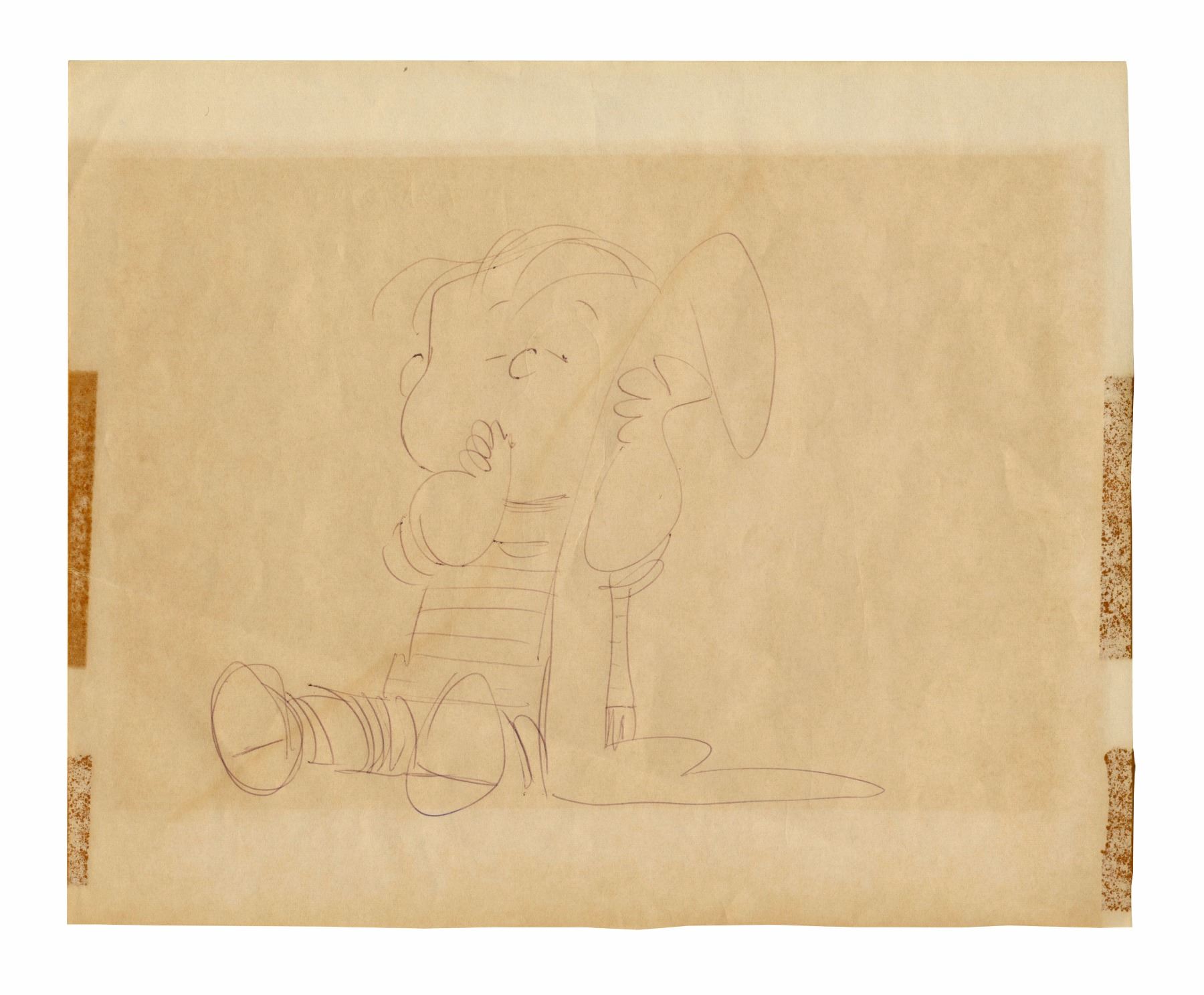 Charles Schulz drawing of Linus, shown holding his security blanket. Circa late 1950s. Page measures 10'' x 8.25''. Toning and discoloration from tape to margins. Very good condition.
