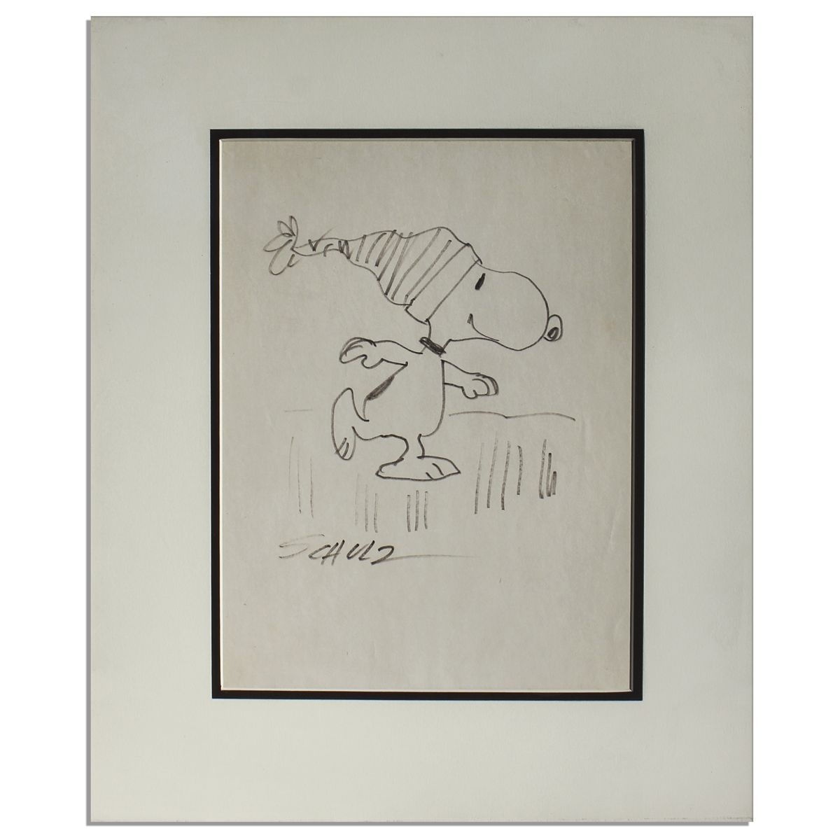 Charles Schulz hand drawing of his ''Peanuts'' star, Snoopy. The smiling anthropomorphic Beagle dons a stocking cap and seems to skate across the page on his rear paws while using his forelegs for balance. Felt-tip sketch is signed ''Schulz'' at the bottom. Matted and framed to an overall size of 15.25'' x 18.25''. Art has not been removed from the frame for further inspection but appears near fine.