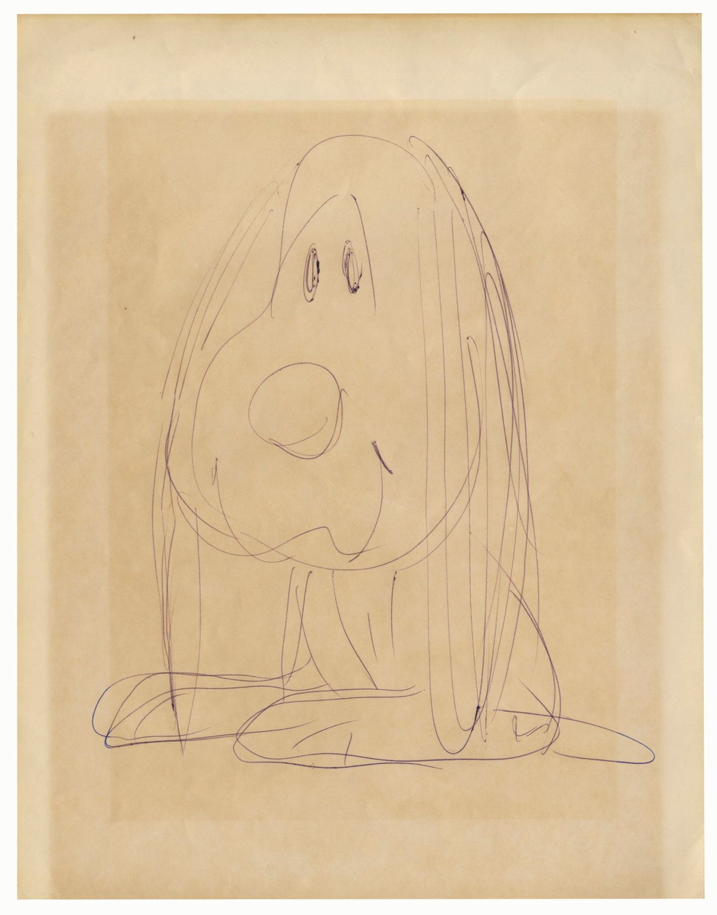 Charles Schulz original drawing of Snoopy, circa late 1950s, with Snoopy shown here with a bashful or contrite expression. Measures 8.5'' x 11''. Toning, otherwise near fine.
