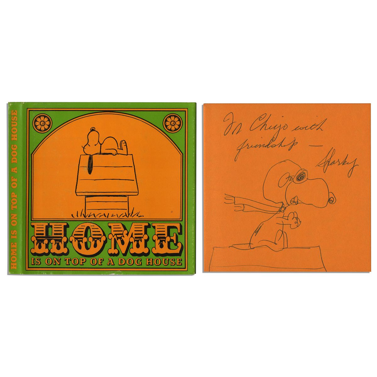 Charles Schulz original drawing of Snoopy as the Flying Ace, drawn within his book, ''Home is on Top of a Dog House''. Published by Determined Productions: San Francisco: 1966. Schulz's sketch of Snoopy in his iconic WWI flying ace costume atop his doghouse appears on the front free endpaper of the ''Peanuts'' book. Sketch is signed, ''For Chujo with friendship - Sparky''. Book in the style of Schulz's classic original, ''Happiness is a Warm Puppy'', is printed in orange and black on green leaves. Unpaginated book with a comic on every page is bound in paper boards with original dustjacket. Measures 5.75'' square. Book is near fine, with ever-so-slight wear to spine ends. Small tear to bottom edge of dustjacket on the front panel, else near fine.