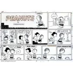 Charles Schulz - Original Comic Strip Art for Peanuts Sunday dated 9-2-56 (United Feature Syndicate, 1956). One of the most beloved comic strips of all time made its debut in 1950 and quickly became the most successful comic strip in newspaper history. This early example, created just six years into the strip's life, shows Schulz's exceptional command of the medium in this three-tier Sunday page. In excellent condition, this page measures approximately 17" x 23.5" with an image area of approximately 15.5" x 22.5" and is signed by Schulz in the penultimate panel. Early examples of this landmark strip are extremely rare, especially the highly desirable Sundays. Important notice: We expect to be auctioning lots at the rate of 200-250 per hour. Sometimes eBay Premier live bid software cannot keep up with that pace, so we strongly recommend that you place a realistic proxy bid now as insurance to avoid disappointment. Also please note that all Heritage/CAA lots purchased through eBay Premier carry a 20% Buyer's Premium. Please make sure you read the Terms and Conditions.