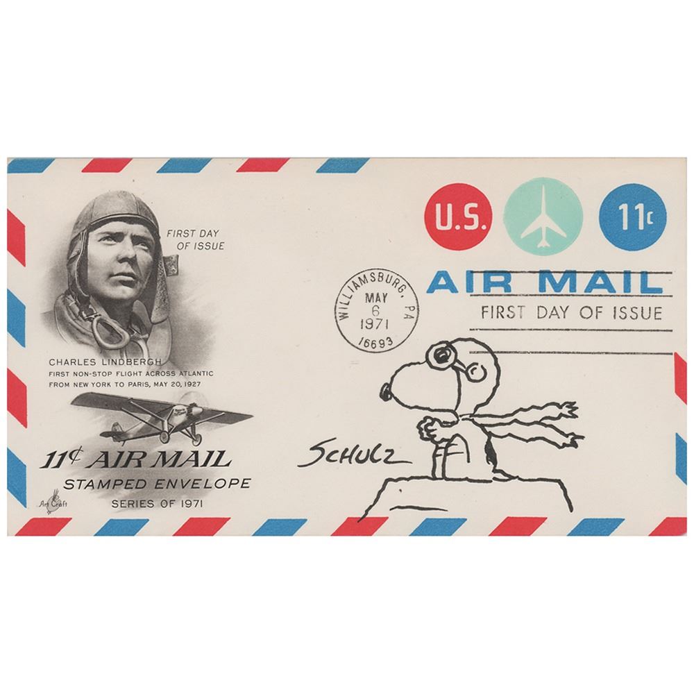 Original sketch of Snoopy by Charles Schulz, which depicts Charlie Brown's pet pooch sitting atop his doghouse as a World War I Flying Ace, accomplished in black felt tip on a 6.5 x 3.5 FDC with a cachet honoring Charles Lindbergh, signed next to the sketch, "Schulz." In fine condition.