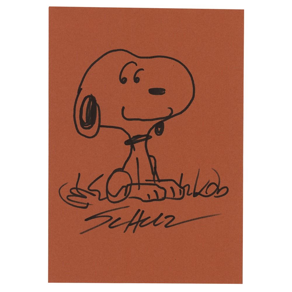 Original sketch of Snoopy by Charles Schulz, depicting Charlie Brown's beloved pet dog sitting obediently in a patch of grass, accomplished in black felt tip on a brown 6 x 8.75 sheet, which is signed below, "Schulz." In fine condition, with two trivial creases to the left side. A wonderful Peanuts drawing just begging for display.