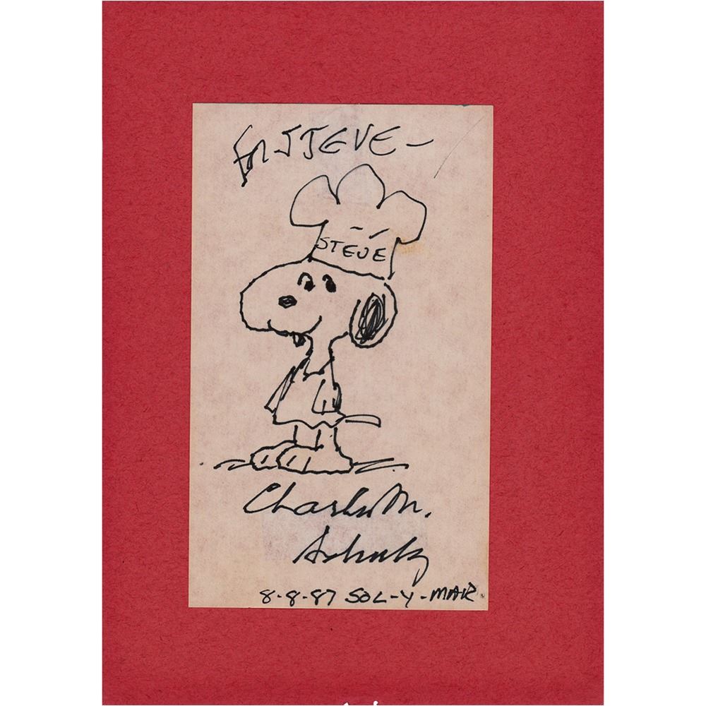 Original sketch by Charles Schulz of Charlie Brown's pet dog Snoopy, showing the iconic Peanuts canine standing in a full-length pose wearing a chef's hat bearing the name 'Steve,' accomplished in black ink on an off-white 3 x 5 sheet that is signed and inscribed, "For Steve—Charles M. Schulz, 8-8-87 Sol-y-mar." The sketch is affixed to a slightly larger sheet and is in fine condition. Accompanied by a full letter of authenticity from JSA.