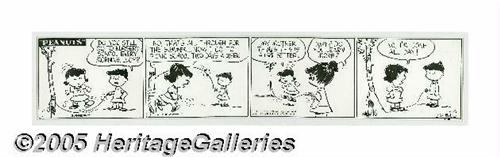 <B>Charles Schulz - Peanuts Daily Comic Strip Original Art, dated 7-18-53 (United Features Syndicate, 1953).</B></I> Lucy and Violet share some quality jump-rope time, and we discover -- big surprise -- that Lucy's mom finds her just as insufferable as the rest of humanity! The crabby Lucy Van Pelt had debuted in <I>Peanuts</B></I> just a little over a year earlier (3-3-52 to be exact), but quickly became established as the <I>Grande Dame</B></I> of all fussbudgets. This darling daily from very early in the run is a prime example of why we love Lucy. Please note that the first panel of this strip is a computer-printed replacement, scanned from the published version and matted with the three remaining original panels to complete the presentation; the other three panels were cut into individual panels at some point, but they have been expertly re-mounted and tastefully matted; the cuts, which do not affect the artwork, are only noticeable upon close examination. The image area measures 26.5" x 5" and is otherwise in Very Good condition.