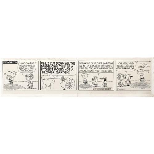 <B>Charles Schulz - Peanuts Daily Comic Strip Original Art, dated 4-7-65 (United Features Syndicate, 1965).</B></I> As comics historian Rick Marschall has pointed out about <I>Peanuts</B></I>, "the Great American Strip often takes place during the Great American Pastime." This droll daily from the sixties is a terrific example of why we root for Charlie Brown, especially when he's on the baseball diamond. Frieda and Lucy co-star in this daily, while Charlie Brown bravely bears their gardening banter -- they're more interested in begonias than baseball. The strip was signed and inscribed by Charles Schulz in the upper border. The image area of this daily measures 27" x 5.5". The strip has been lightstruck, and as a result, the paper surface has darkened. The strip was folded between panels two and three; otherwise, the daily is in Very Good condition.