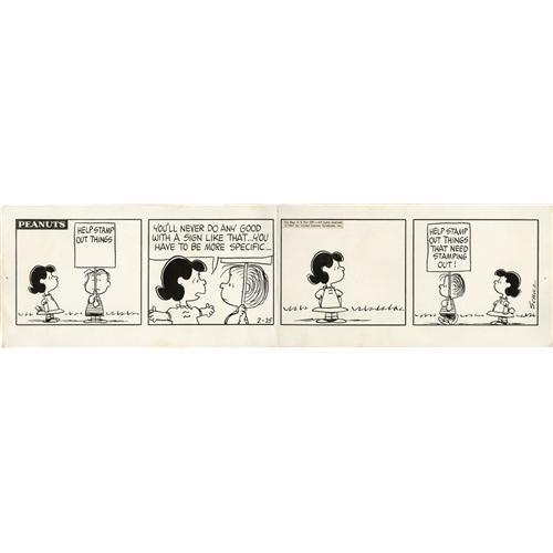 <B>Charles Schulz - Peanuts Daily Comic Strip Original Art, dated 2-25-67 (United Feature Syndicate, 1967).</B></I> Lucy and Linus star in this sixties <I>Peanuts</B></I> daily, during that era when protesting and freedom of speech were all the rage. Queen fussbudget, Lucy Van Pelt, can't help but add her "two cents" on each and everything her little brother, Linus, does, even when it comes to "stamping out things." Somehow, Lucy's sage advice to Linus seldom works out. The image area of this daily measures 27" x 5.5". Aside from a fold between panels two and three (which virtually all <I>Peanuts</B></I> dailies have), the art is in Excellent condition.