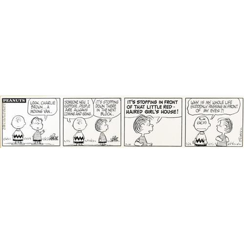 <B>Charles Schulz - Peanuts Daily Comic Strip Original Art, dated 7-14-69 (United Features Syndicate, 1969).</B></I> When it seems the little red-headed girl may move out of Charlie Brown's life forever, his whole life flashes before his eyes. The seldom-seen little red-headed girl became the symbol of unrequited loved for a whole generation of <I>Peanuts</B></I> readers, and this is an exceptionally poignant daily. Linus co-stars in this melodrama. The image area of the strip is approximately 27" x 5.5". The daily was folded between panels two and three; otherwise, the art is in Excellent condition.