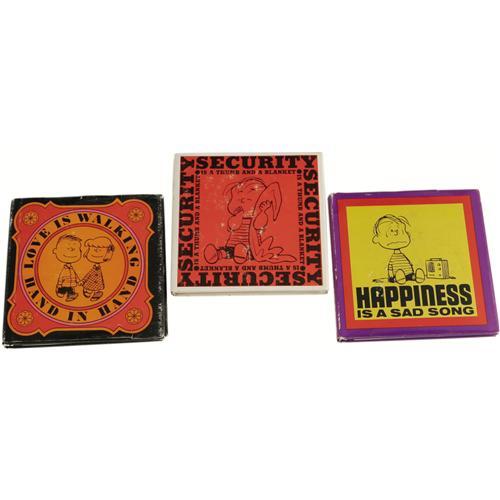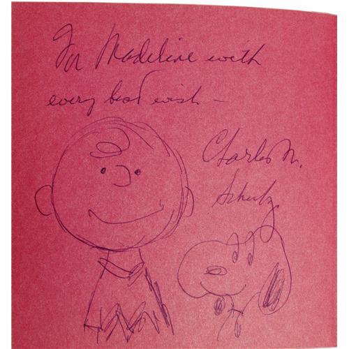 <B>Charles Schulz - Peanuts Hardback Book, Group of 3, 2 with Autographs (Determined Productions, 1963-67) Condition: Average FN.</B></I> This collection of <I>Peanuts</B></I> novelty books includes two that have been signed by the author, Charles Schulz. Included in this group are <B>Love is Walking Hand In Hand</B></I>, with a beautiful full-page signature, personal inscription, and sketch of Charlie Brown and Snoopy, done in blue ball-point pen, on magenta paper. Our second signed book is a copy of <B>Security is a Thumb and a Blanket</B></I>, signed by Schulz on page seven, which features a printed portrait of Charlie and Snoopy on yellow paper. Also included in this lot is an unsigned copy of <B>Happiness is a Sad Song</B></I>. All books are 5.75" x 5.75" hard cover books with dust jackets.