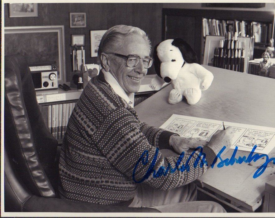 Black and white original 7x9 press photo from CBS signed by Peanuts creator Charles Schulz. The slug is still on the reverse of the photo. All items come with a certificate of authenticity good for the life of the piece.