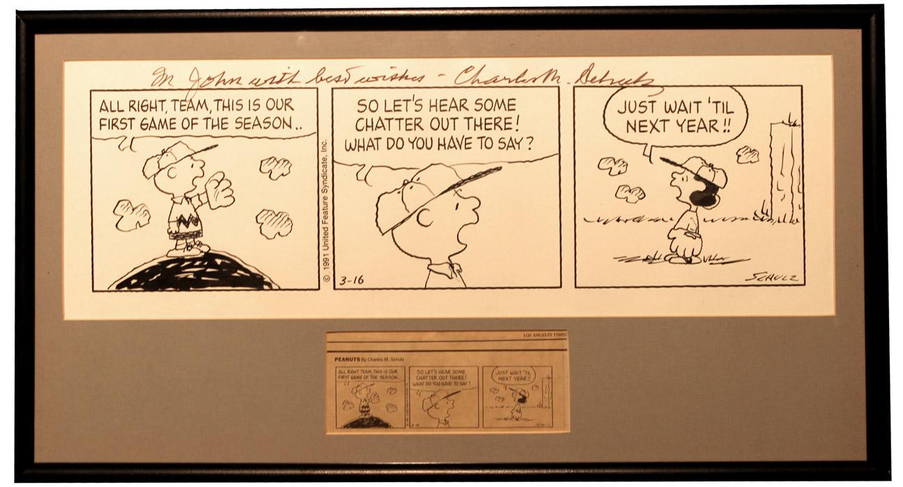 Original ''Peanuts'' comic strip, hand-drawn and signed by Charles Schulz, from 16 March 1991. A fine example of the popular baseball themed strips, the three-framed panel shows Charlie Brown ready to pitch the first game of the season and trying to pump up his team. Lucy, in response, retorts, ''Just wait 'til next year'' in typical defeatist sports lingo. Signed, ''For John with best wishes -- Charles M. Schulz'' across top of strip. Black frame with simple gray mat measures 23.25'' x 12.75'', with an ''L.A. Times'' printed version of the comic framed beneath the original strip. Fine condition. An exceptional and rare strip with baseball content, among the most coveted of ''Peanuts'' strips.