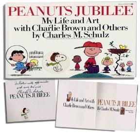 Gorgeous, fine copy of ''Peanuts Jubilee'' signed and inscribed by Charles Schulz who writes on the half-title page in black marker, ''For Rollie with appreciation and every best wish - Charles M. Schulz''. Ballantine Books: New York: 1976. Softcover book measures 11'' x 8'' and runs 224 pages with hundreds of color strips from 1950 through 1975. Fine condition.