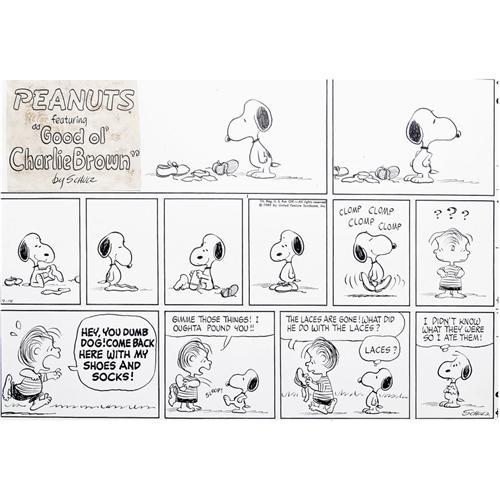 <B>Charles Schulz - Peanuts Sunday Comic Strip Original Art, dated 9-14-69 (United Features Syndicate, 1969).</B></I> To paraphrase a famous hit song, "These shoes were made for walking" -- but apparently, the shoelaces were made for eating. Hey, that's what dogs do. Snoopy and Linus star in this well-heeled Sunday. With a portrait of Snoopy in nearly every panel, this Sunday is sure to delight any <I>Peanuts</B></I> fan. The image area of this Sunday measures 22" x 15", and aside from some mild paper aging to the title stat, the art is in Excellent condition.<BR><BR><b>Shipping:</b> Large Flat (<a target="_blank" href="http://www.heritageauctions.com/common/shipping.php">view shipping information</a>)