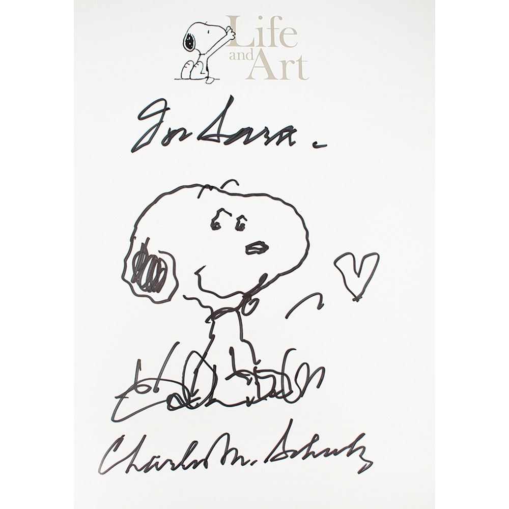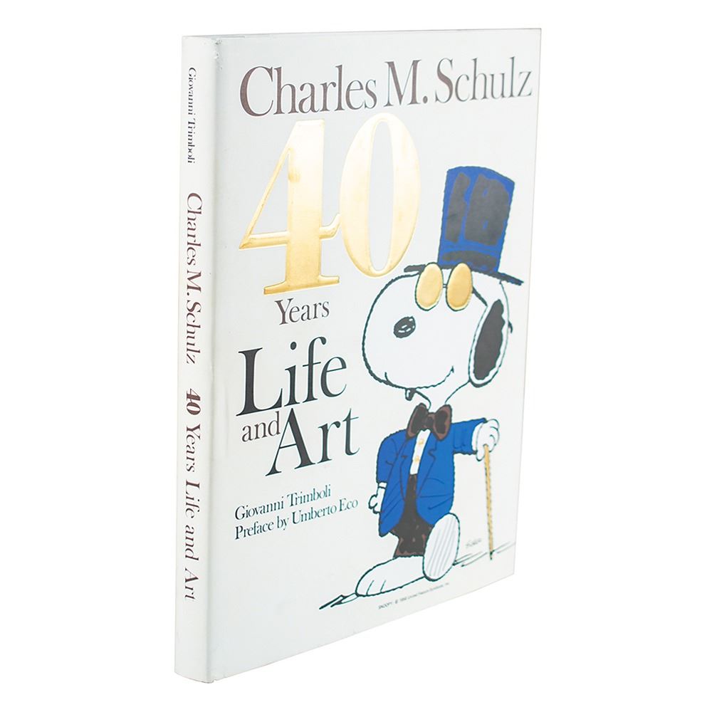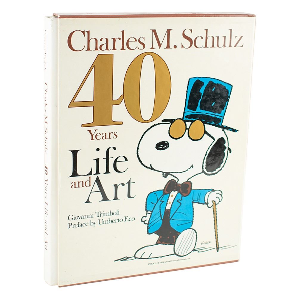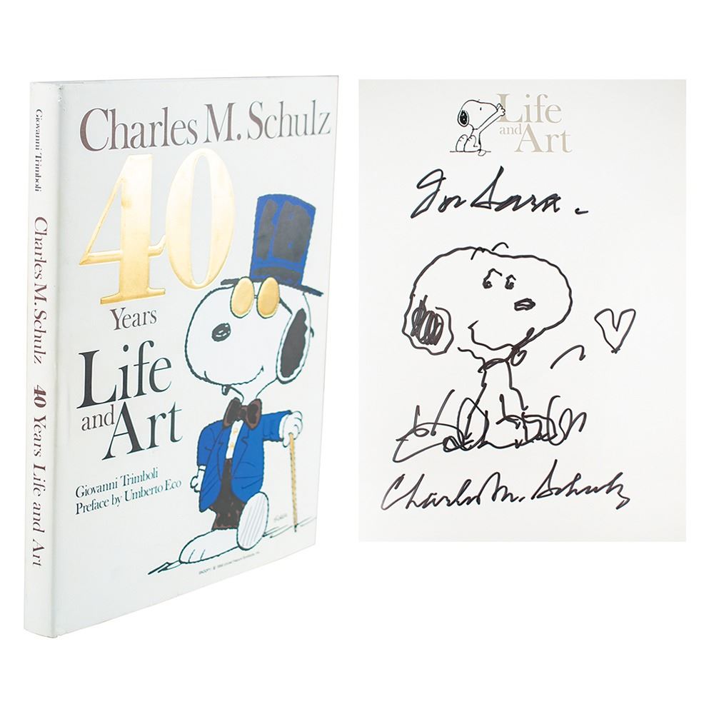 Desirable signed book: Charles M. Schulz: 40 Years Life and Art. NY: Pharos Books, 1990. Hardcover with slipcase, 9.75 x 13, 173 pages. Signed and inscribed on the half-title page in black felt tip, "For Sara—Charles M. Schulz," who adds a small heart next to a wonderfully large sketch of Snoopy seated in grass. In fine condition, with some light scuffs and wear to the slipcase.