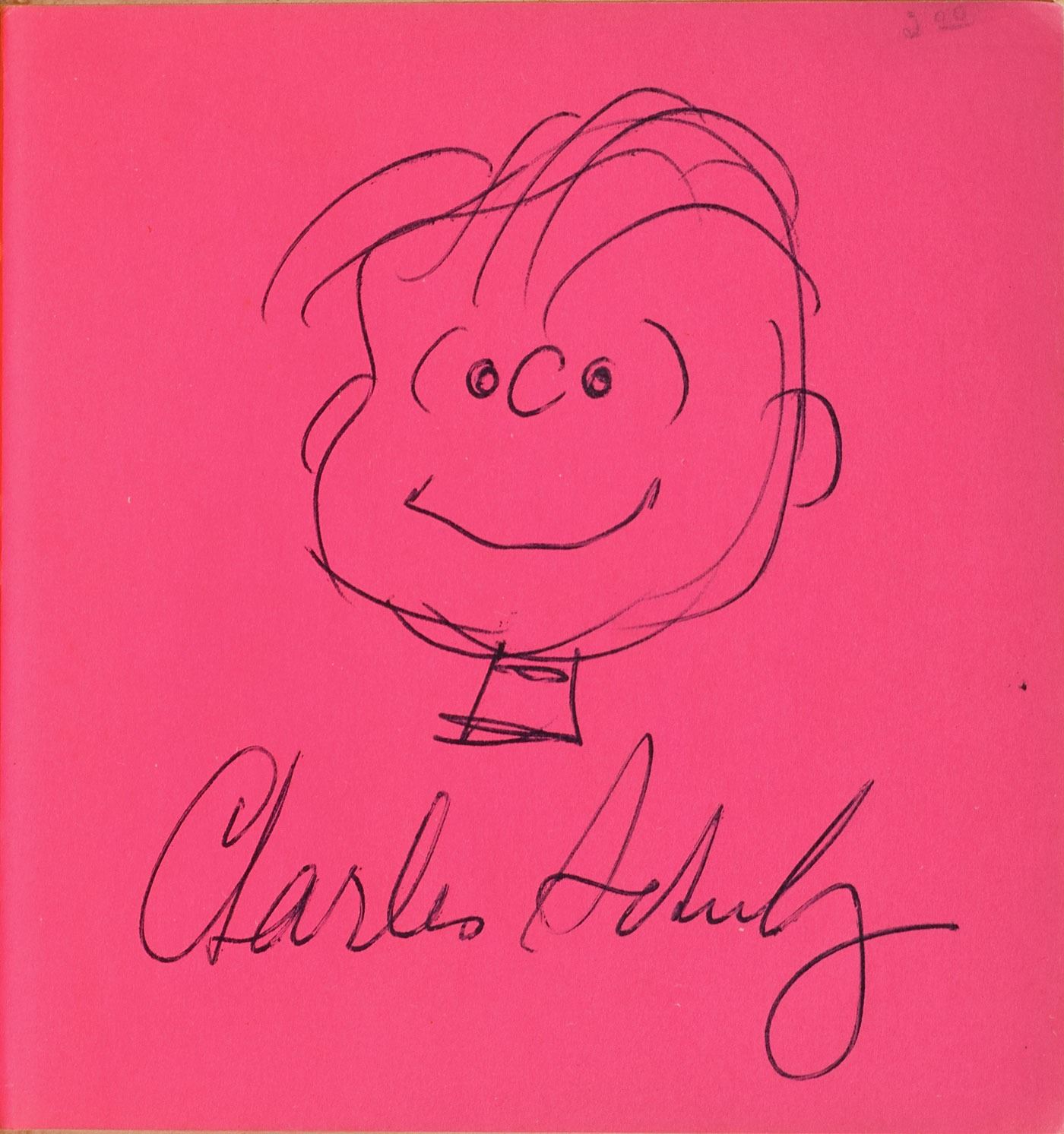 Signed book: Happiness Is a Warm Puppy. First edition. California: Determined Productions, 1962. Hardcover, 5.5 x 5.75. Signed on the first free end page in black ballpoint by Schulz, who adds a wonderful sketch of a smiling Linus van Pelt. In fine condition.