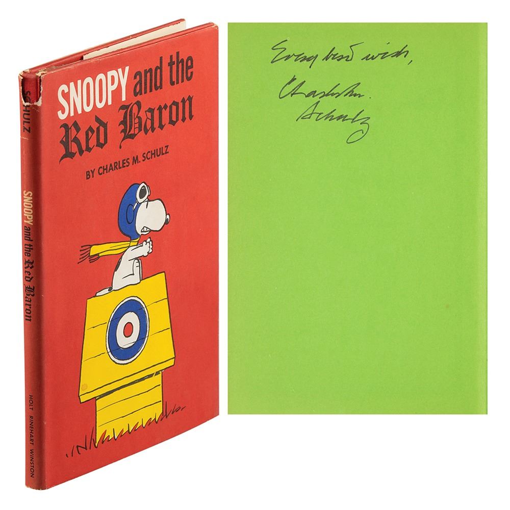 Signed book: Snoopy and the Red Baron. First edition. Holt, Rinehart and Winston, 1966. Hardcover, 5.5 x 8.25, 58 pages. Signed on the page adjacent to the title page in black felt tip, "Every good wish, Charles M. Schulz." In fine condition, with paper loss to the head of the dust jacket spine.