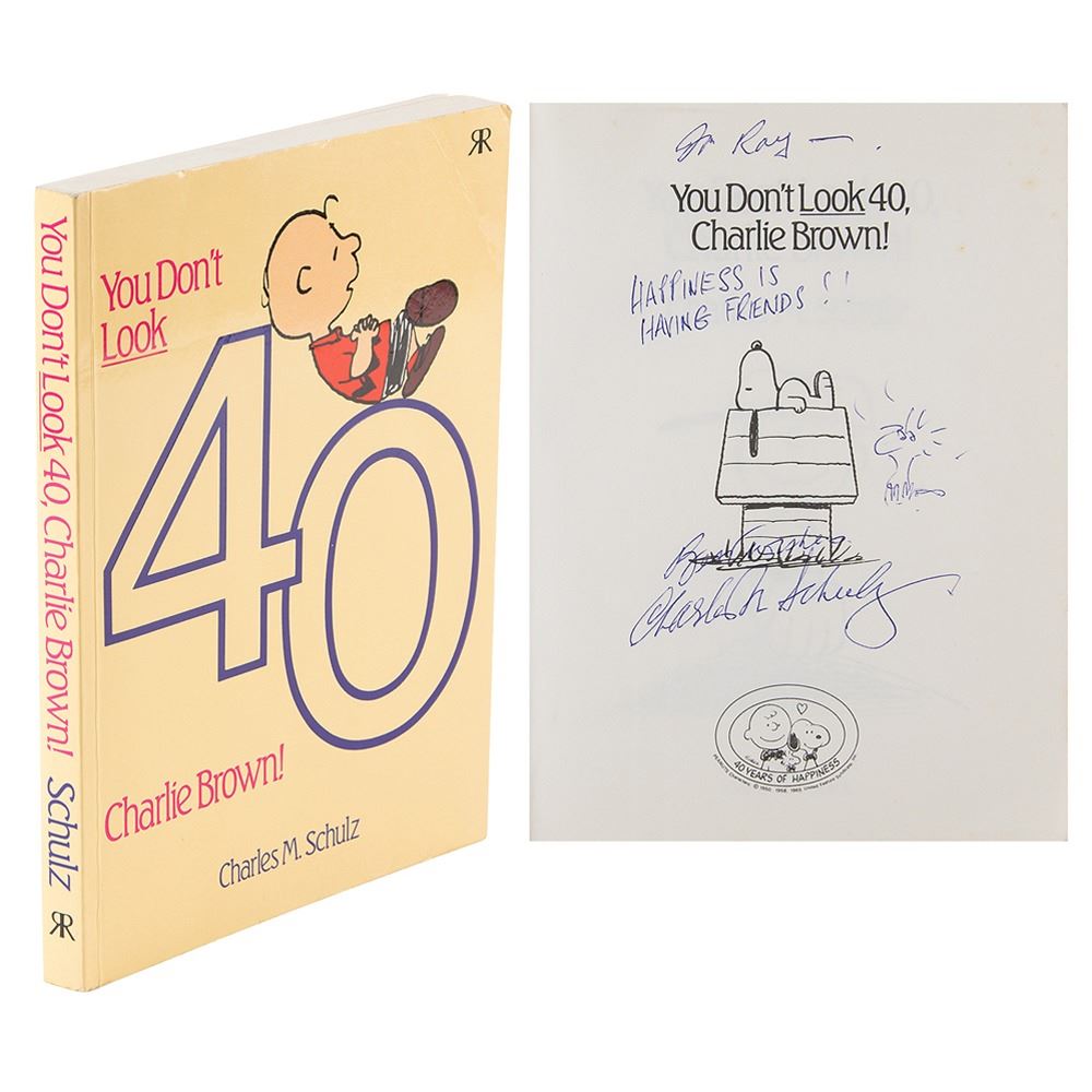 Signed book: You Don't Look Forty, Charlie Brown. Horsham, West Sussex: Ravette Books, 1990. Softcover, 7 x 9. Signed and inscribed on the half-title page in blue ballpoint, "For Ray—Happiness is having friends!! Best wishes, Charles M. Schulz," who adds a wonderful small sketch of Woodstock to the right. In fine condition, with light creasing the cover.