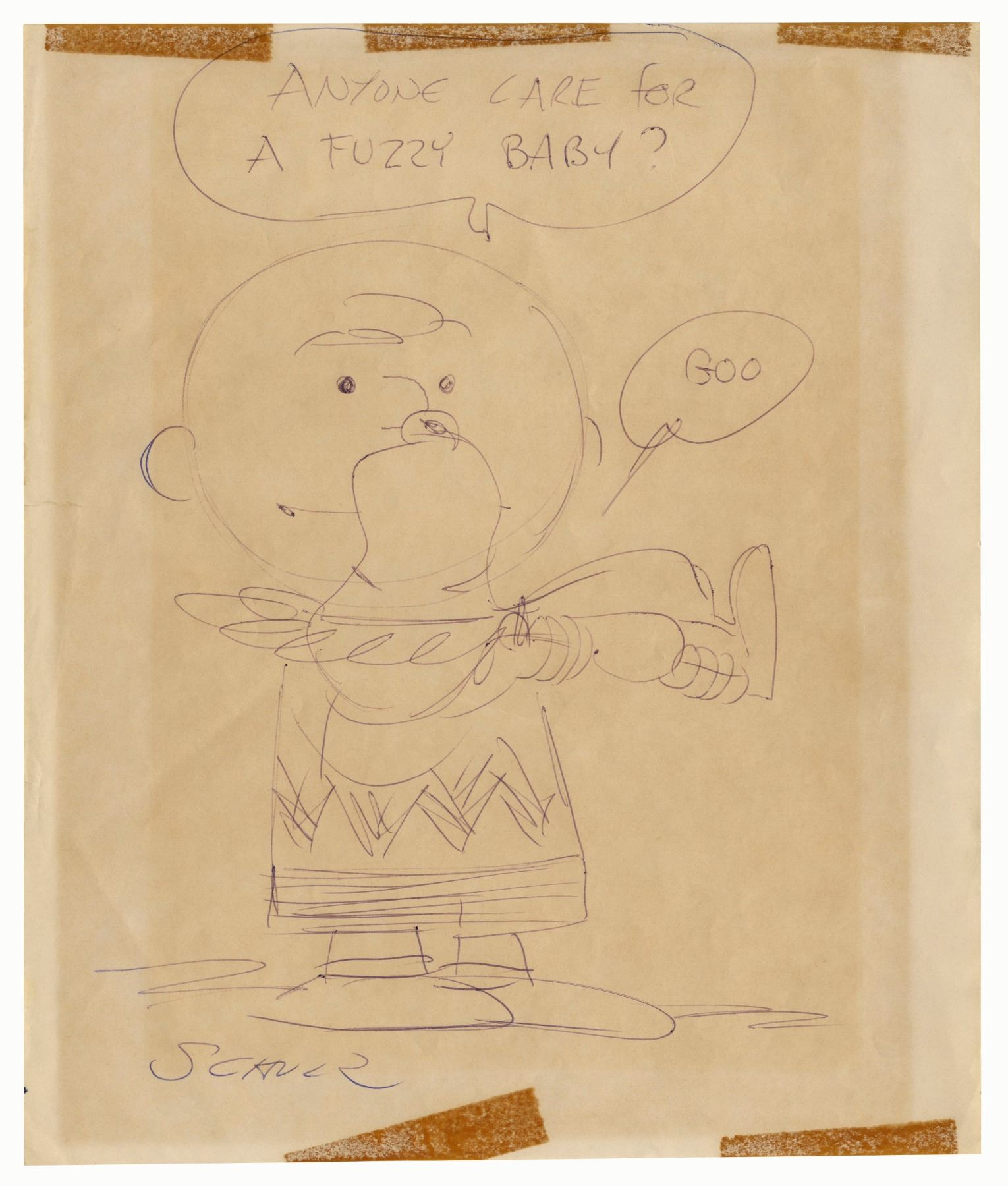 Charles Schulz signed drawing of his most famous ''Peanuts'' characters, Charlie Brown and Snoopy. Circa late 1950s, Charlie Brown is shown here holding Snoopy, asking ''Anyone care for a fuzzy baby?'' to which Snoopy babbles ''Goo''. Measures 8.5'' x 10''. Toning and tape discoloration to edges. Overall very good condition.
