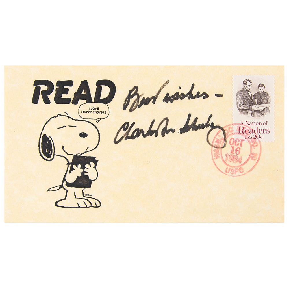 Limited edition cover with a literary awareness "READ" cachet of Snoopy holding a book and thinking 'I love happy endings,' numbered 14/30, postmarked on October 16, 1984, signed in black felt tip, "Best wishes—Charles M. Schulz." In fine condition. Accompanied by a block of two Peanuts stamps.