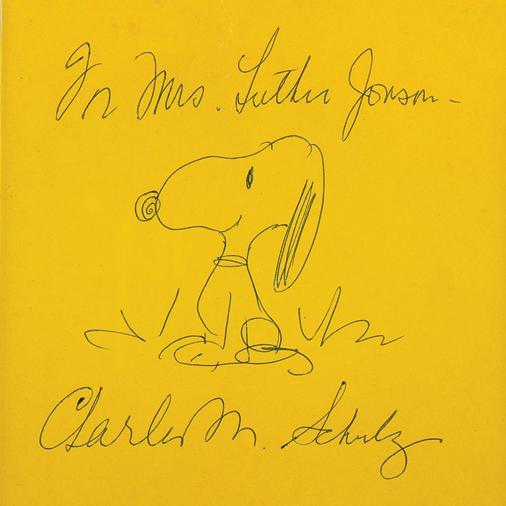Original vintage ballpoint sketch of Snoopy accomplished by the Peanuts creator on a yellow 5.25 x 5.5 card, signed and inscribed in blue ballpoint, "For Mrs. Luther Jonson, Charles M. Schulz." In fine condition. Encapsulated in a Beckett authentication holder. A wonderful sketch of the iconic cartoon character.