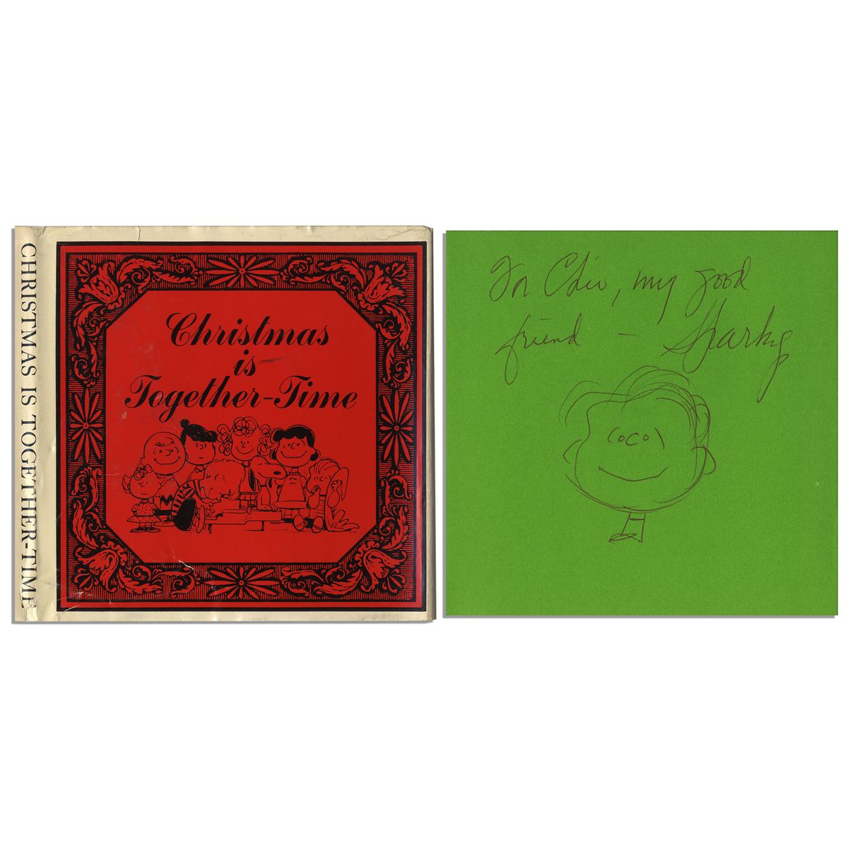 Charles Schulz original Linus sketch signed, within his book, ''Christmas is Together-Time'', published by Determined Productions: San Francisco: 1964. ''Peanuts'' book features Linus sketched in close-up upon the front free endpaper, with Schulz's inscription, ''For Odin, my good friend - Sparky''. Book is printed in black on alternating red and green leaves and features sentiments on Christmas. Unpaginated book with a comic on every page is bound in paper boards with original dustjacket. Measures 5.75'' square. Book is near fine. Very minor tears to dustjacket along the edges, else near fine.