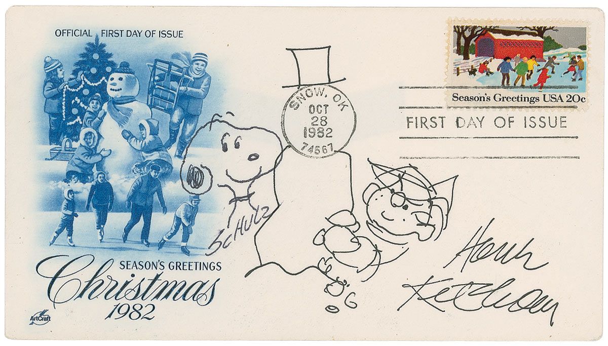 Original signed ink sketch of Snoopy and Dennis the Menace building a snowman on a First Day Cover, honoring Christmas 1982, postmarked October 28, 1982. Ketcham uses the postmark stamp as the head of the snowman, adding Dennis to the right, signing in black ink, “Hank Ketcham,” and Schulz adds Snoopy to the left of the snowman, signing in black ballpoint, “Schulz.” In fine condition.