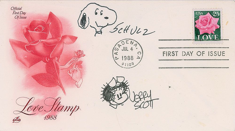 Original signed ink sketch of Snoopy, signed “Schulz,” and Nancy, signed “Jerry Scott,” on a First Day Cover with a cachet honoring the 1988 Love stamp. In fine condition.