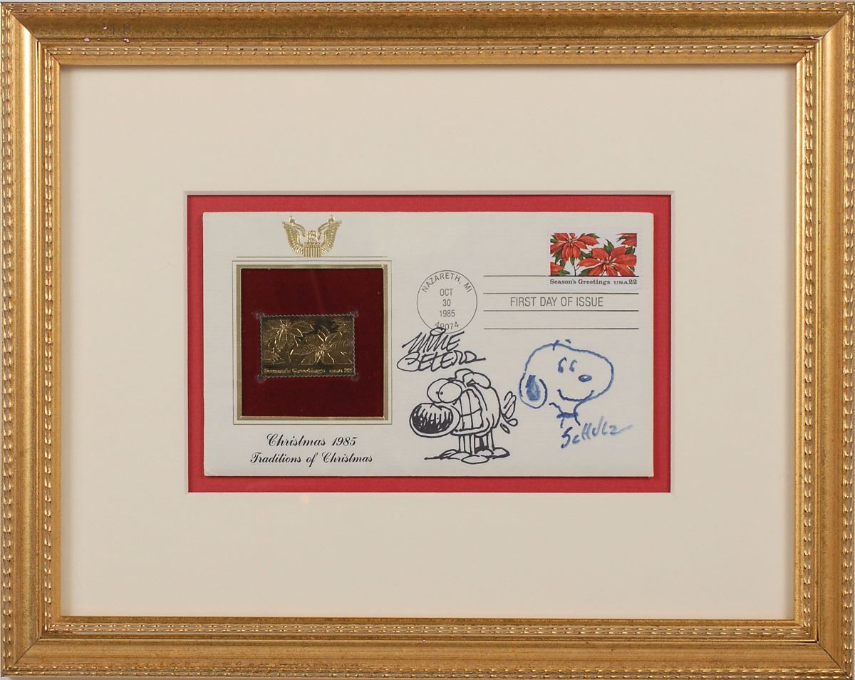 Original felt tip Snoopy and Grimm sketches by Charles Schulz and Mike Peters on an off-white 7.5 x 4.25 First Day Cover with a cachet honoring Christmas of 1985, signed “Mike Peters” and “Schulz.” Framed and in fine condition.