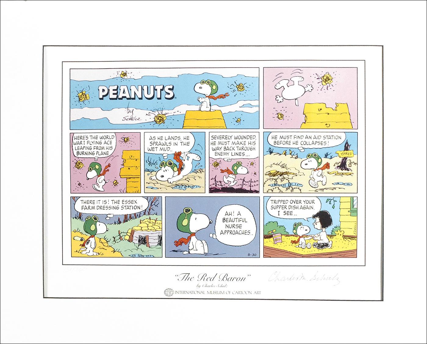 Limited edition color 18 x 13.5 print entitled ‘The Red Baron,’ #131/200, depicting a nine-panel Peanuts Sunday strip of Snoopy as the Red Baron, signed in blue ballpoint. Matted to an overall size of 23 x 18.5. In very fine condition.