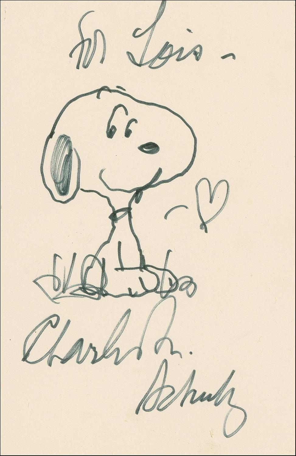 Highly desirable original signed and inscribed felt tip full-length sketch of Snoopy sitting in some grass on an off-white 5.25 x 8 sheet, signed and inscribed “for Lois–Charles M. Schulz.” In fine condition. The inscription could easily be matted out to make an excellent presentation of one of Peanuts’s most beloved characters.